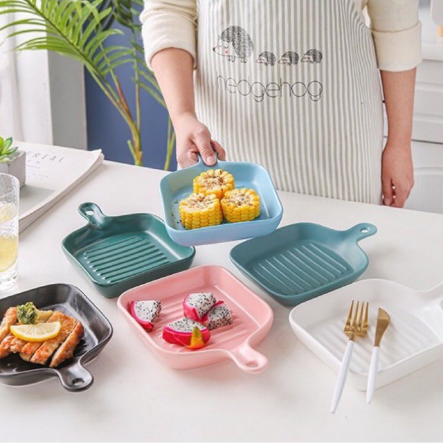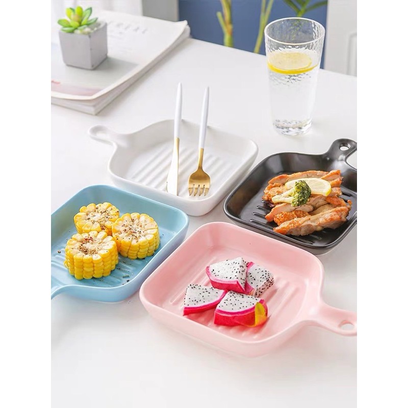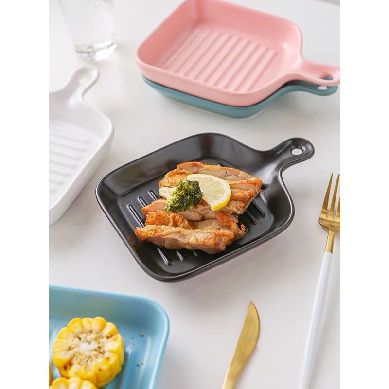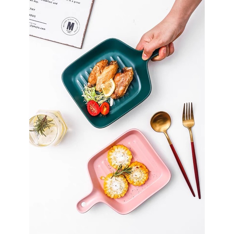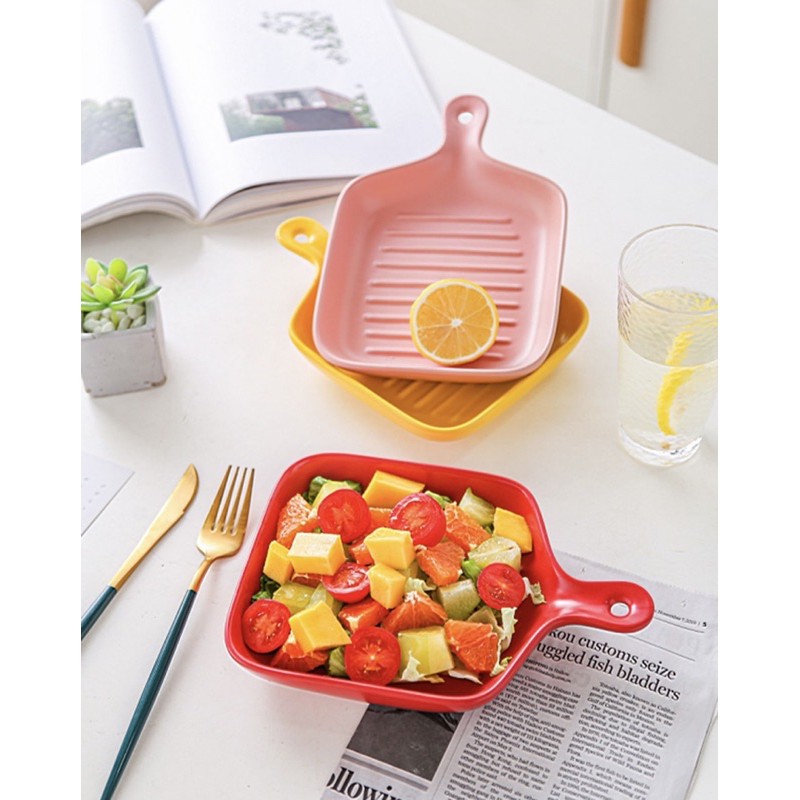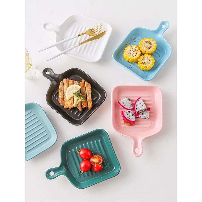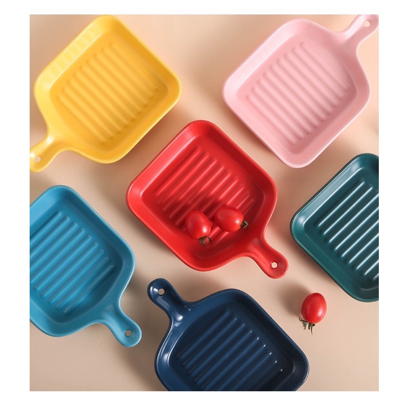 Macaroon Series: Pan-shaped Ceramic Plate with Handle - microwave safe cheese oven bake bowl porcelain