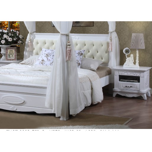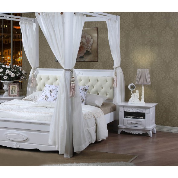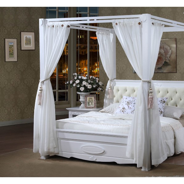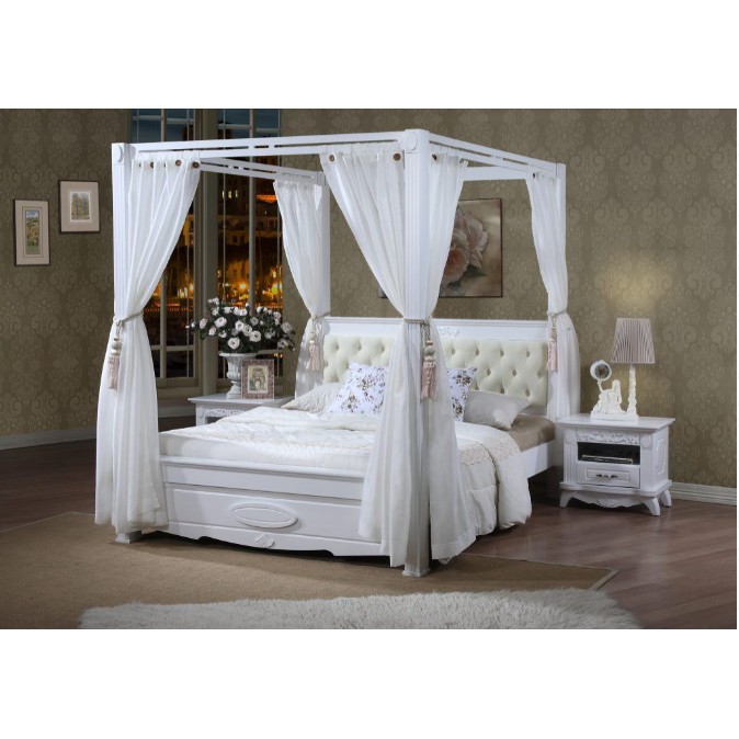 Madonna English Victorian Style Canopy Poster Wooden Bed including White Laced Curtains. Perfect for new Loving Couples.