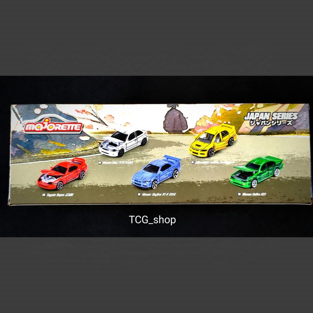 Majorette Japan Nissan GT-R R34, Toyota Supra Mk4, Honda Civic EK9, Mitsubishi Evo 9, Cefiro A31