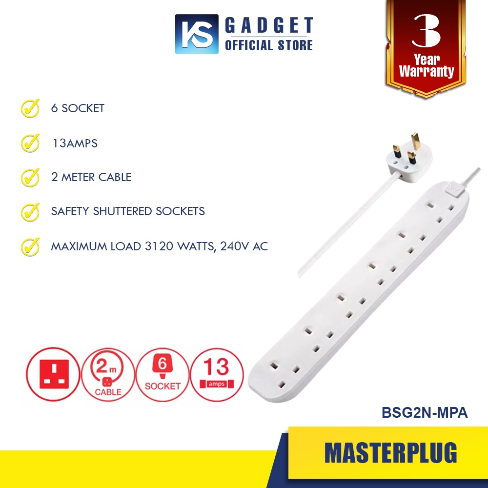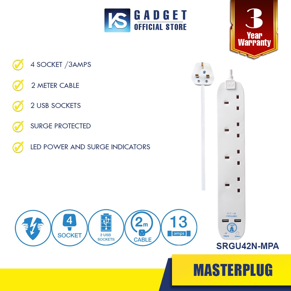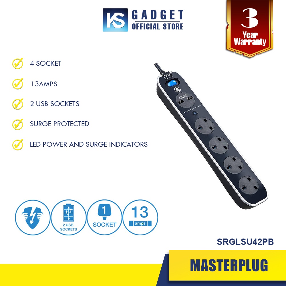 Masterplug Power Socket /Surge Extension Lead/ Premium Surge Protector/ Extension Socket/ USB Power Centre