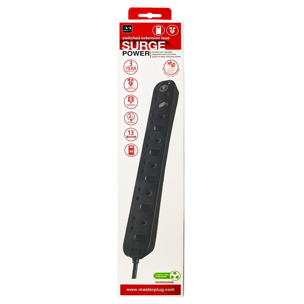 Masterplug Surge Protector 6 Gang 2 Meter Switched Extension Leads Safety Shuttered Sockets Power Cord SWSRG62NB