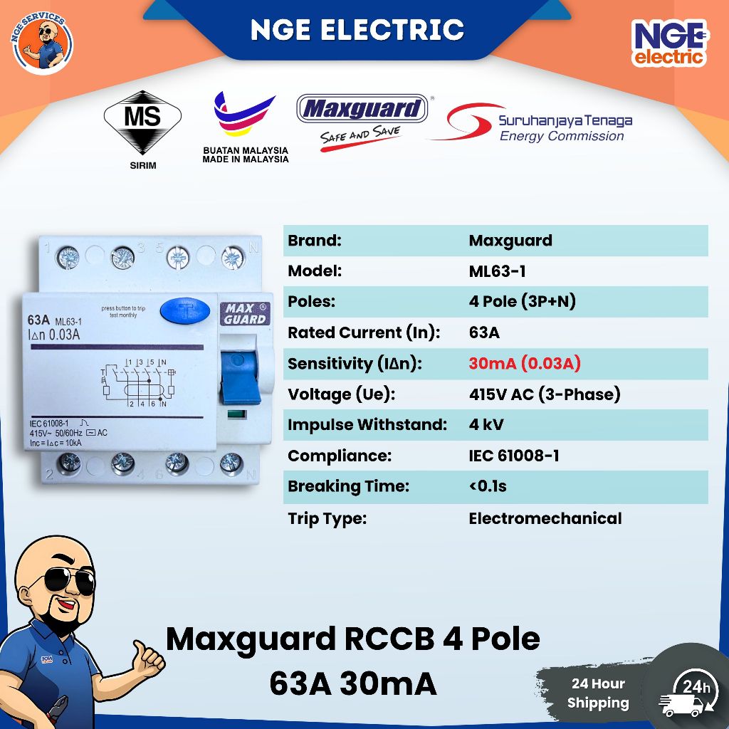 Maxguard ELCB RCCB 3Phase 63A 40A 300mA 4Pole 30/100/300mA