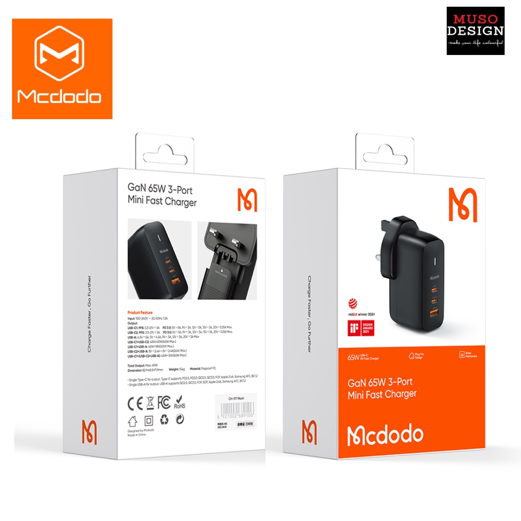 Mcdodo 65W PD GaN Mini 2 USB-C + 1 USB-A Fast Charger 3-ports Wall Charger Phone Laptop Power Adapter UK Plug CH017