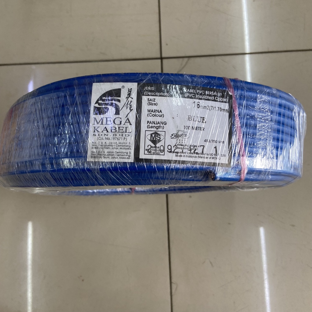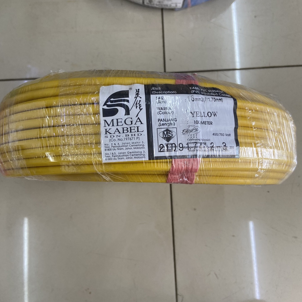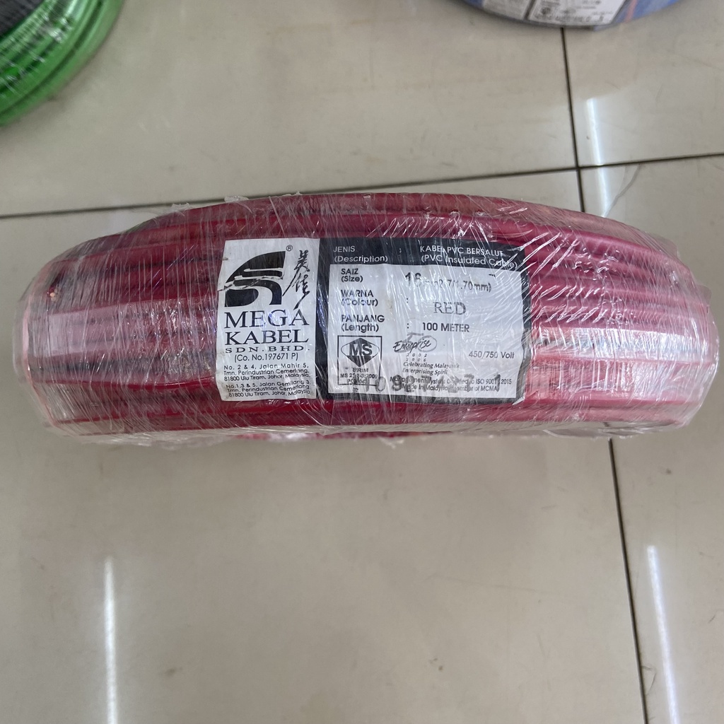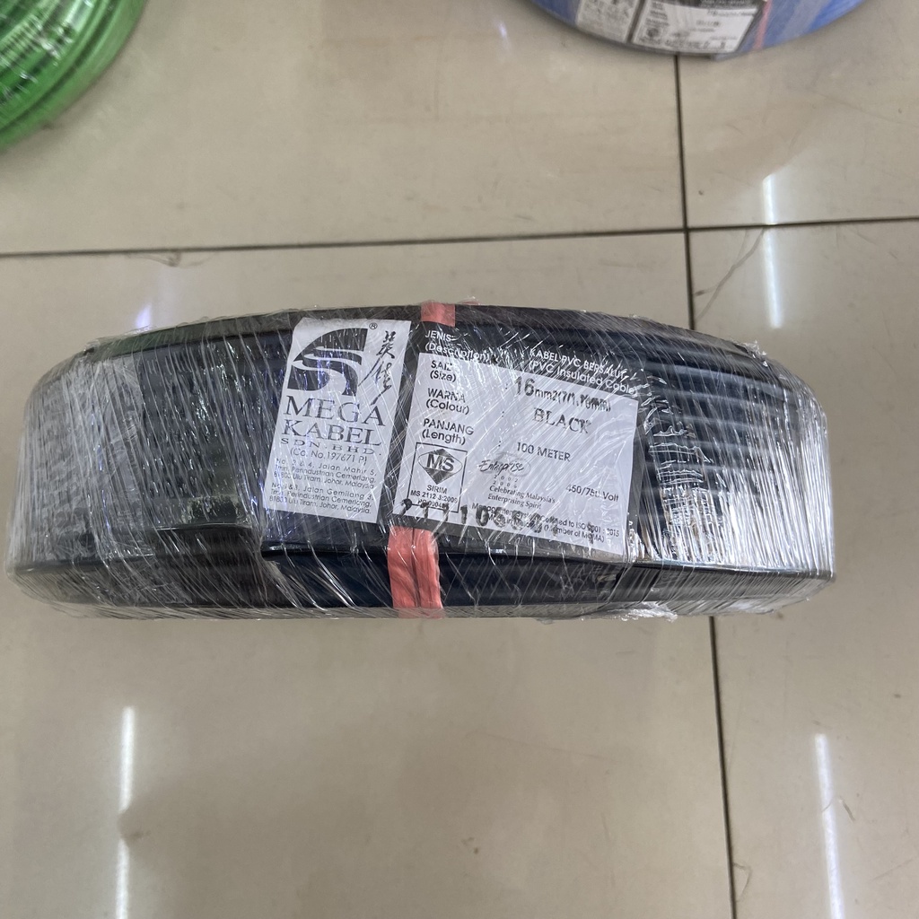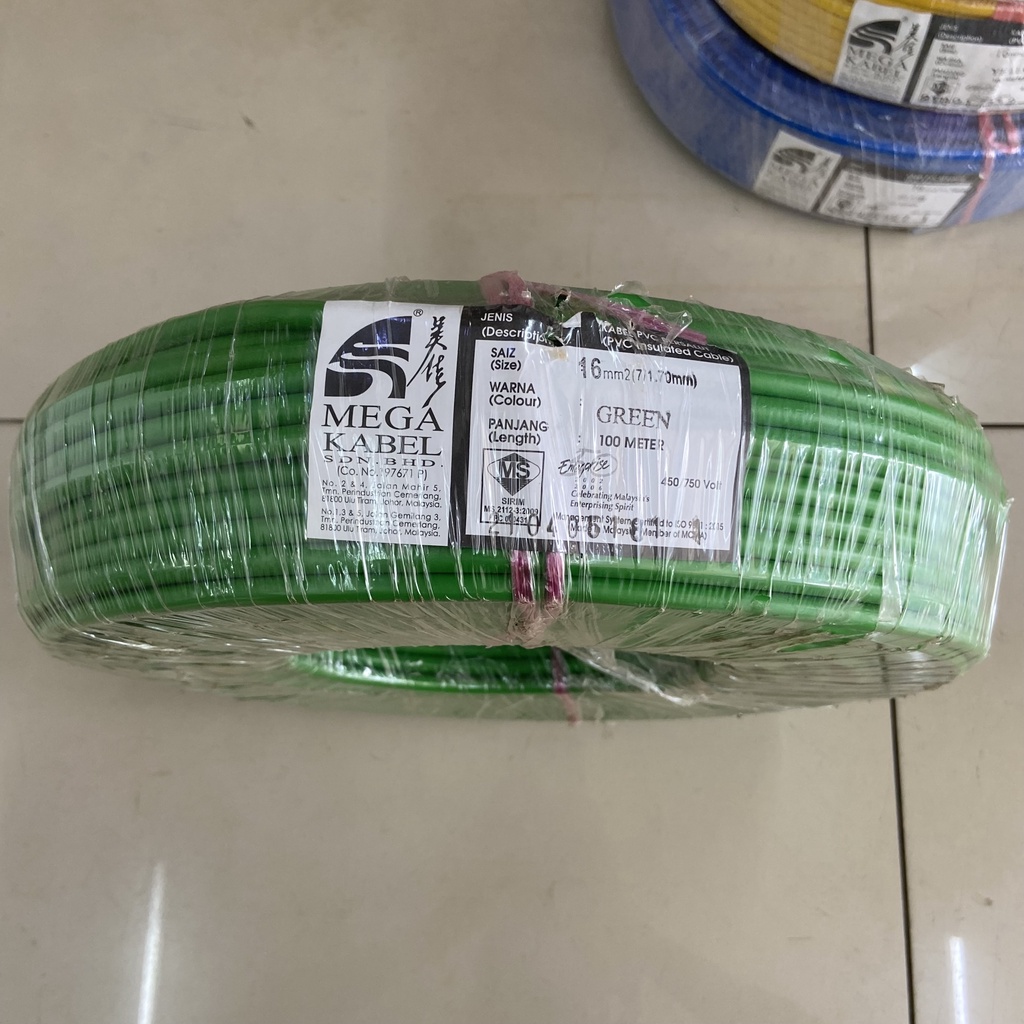 Mega Kabel 10MM 16MM PVC Insulated Cable 100M Green Colour 100% Pure Copper (SIRIM Certifited) 100% Original Best