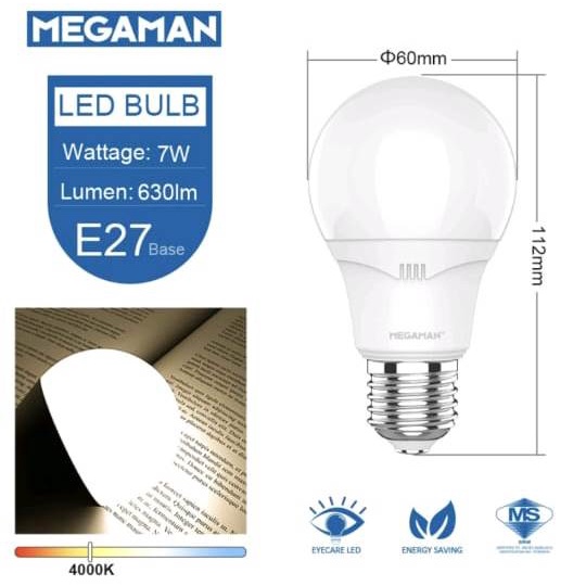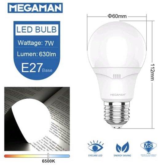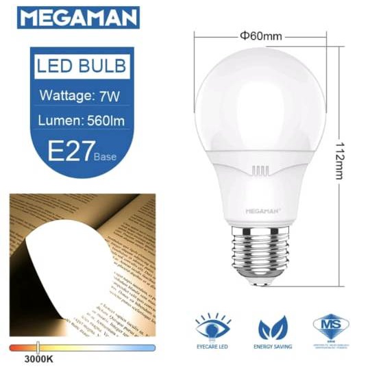 Megaman LED Bulb Light 7W A60 E27 Eye Care Classic Energy Saving Lamp (3000K/4000K/6500K)