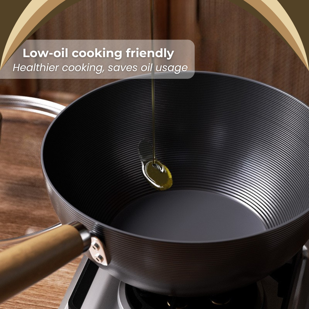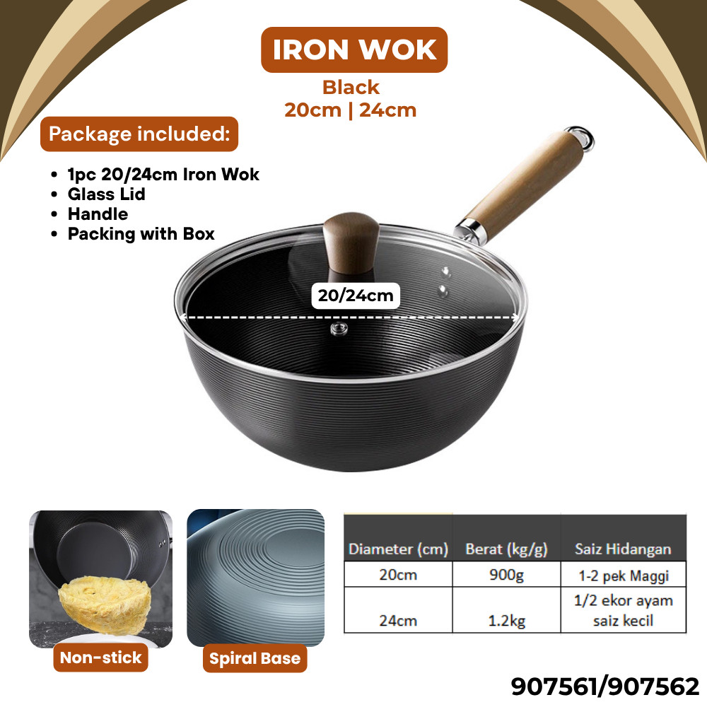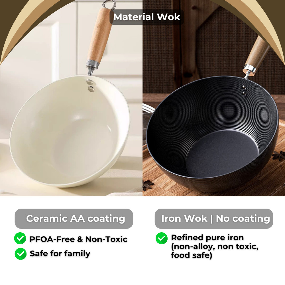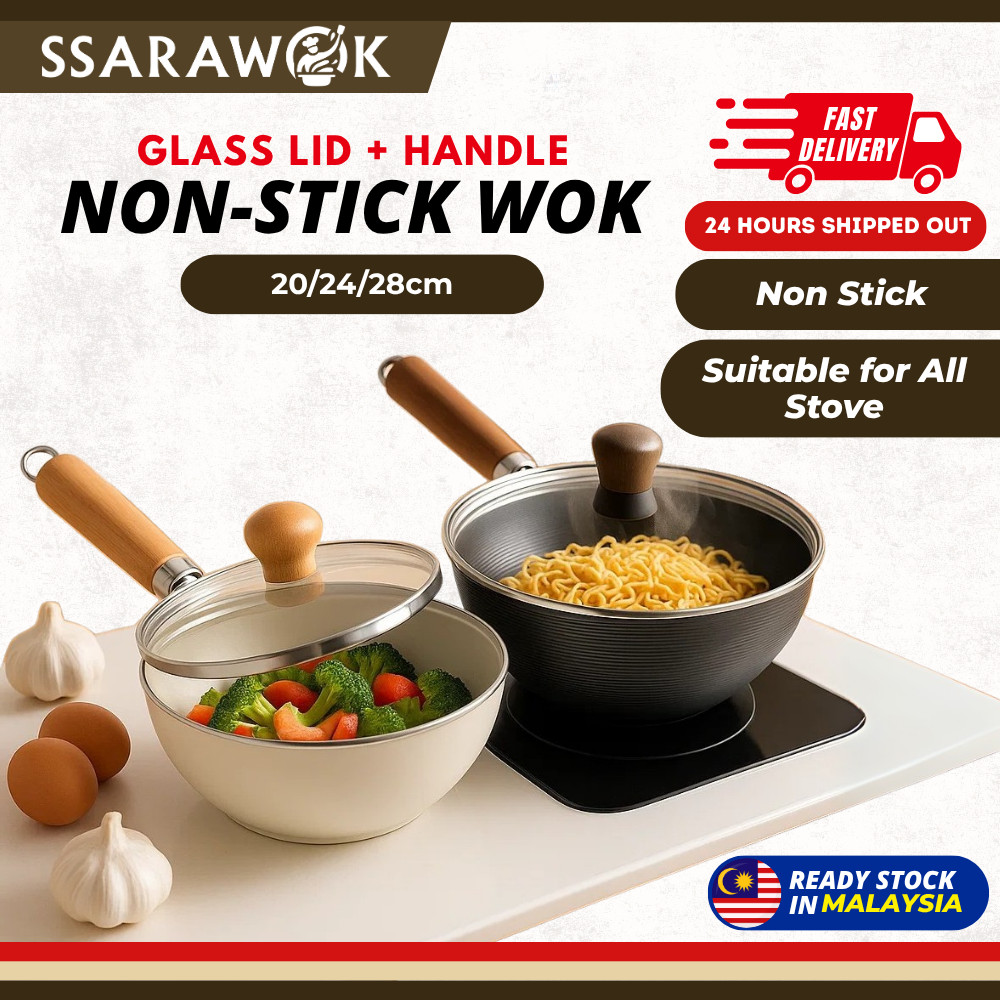 SSARAWOK 20cm/24cm/28cm Non-stick Pan Single Handle Ceramic Iron Wok With Handle Glass Lid Kuali Wok Seramik Anti Lekat
