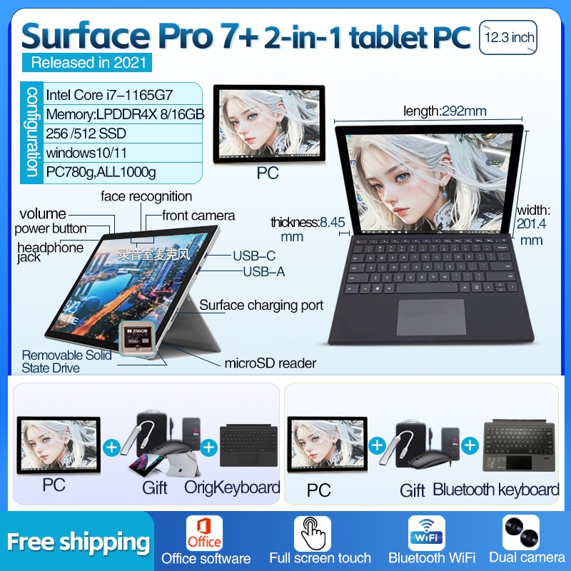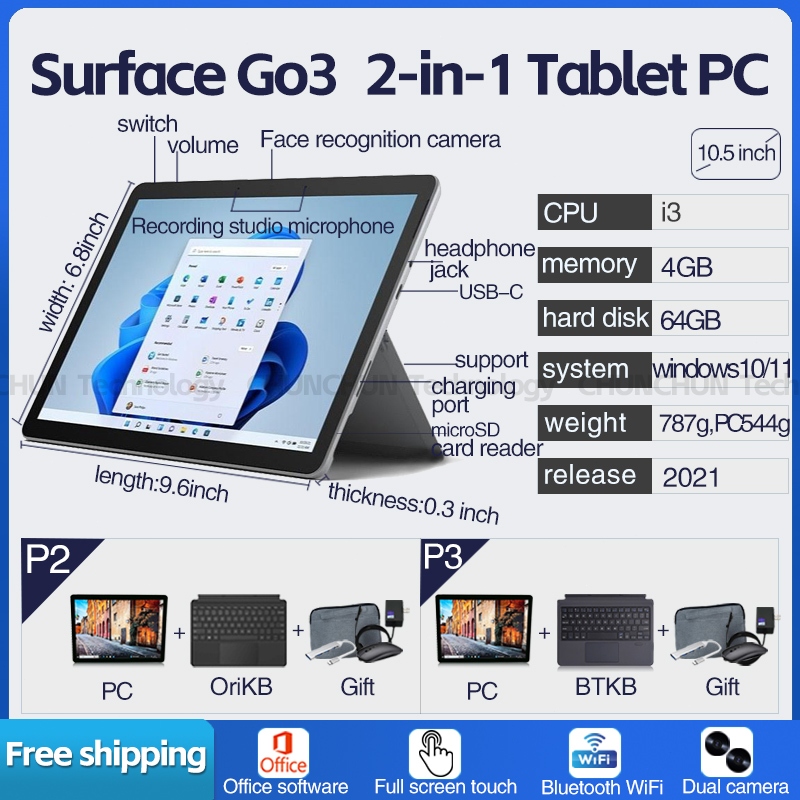 Microsoft Surface Pro7+/7/6/5/4/3 2-in-1 Laptop,12.3-inch Surface Go 3/2 10.5-inch 2-in-1 Laptop Touchscreen Win 11 Pro