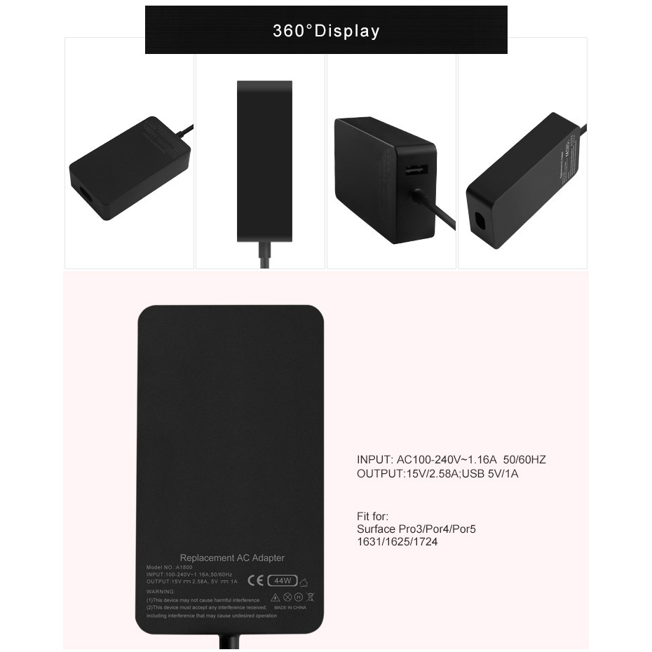 Microsoft Surface Pro 3/ Pro 4/ Pro 5 / Pro 6 / Pro 7 Laptop Charger 15V 2.58A 44W with 5V 1A 15V 2.58A 5V 1A 44W