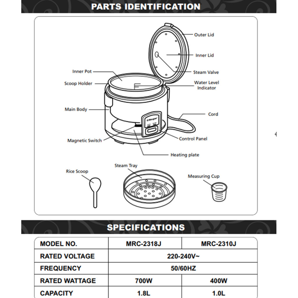 Midea Jar Rice Cooker 2.2L MR-CM2224 / Midea 1.5L Jar Rice Cooker MR-CM1521 / Morgan 1.8L MRC-2318J