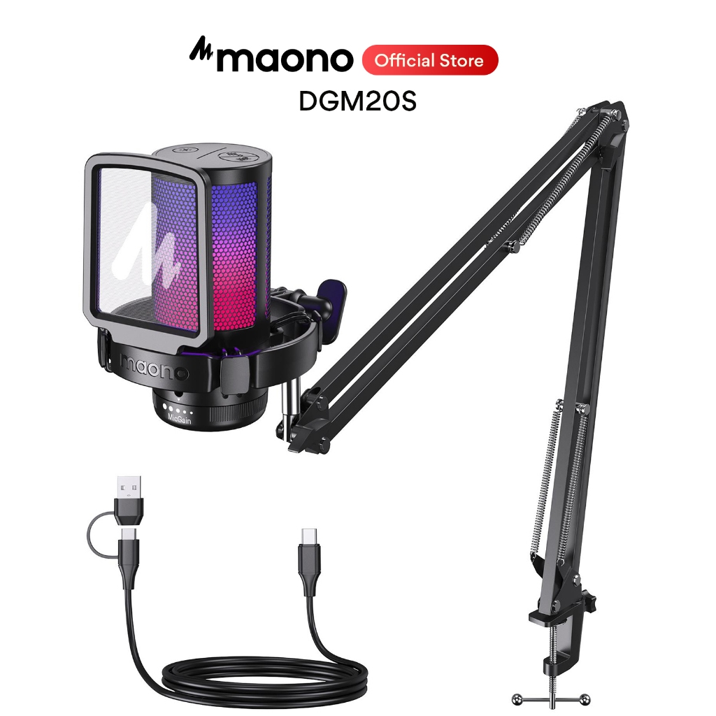 Mikrofon USB Maono DGM20 Mikrofon RGB Permainan Mikrofon Pemeluwap Mic RGB Mic Pembatalkan Bunyi Mic dengan Keuntungan Mikrofon, Cahaya RGB, Satu kekunci bisu untuk PC, Permainan, Rakaman