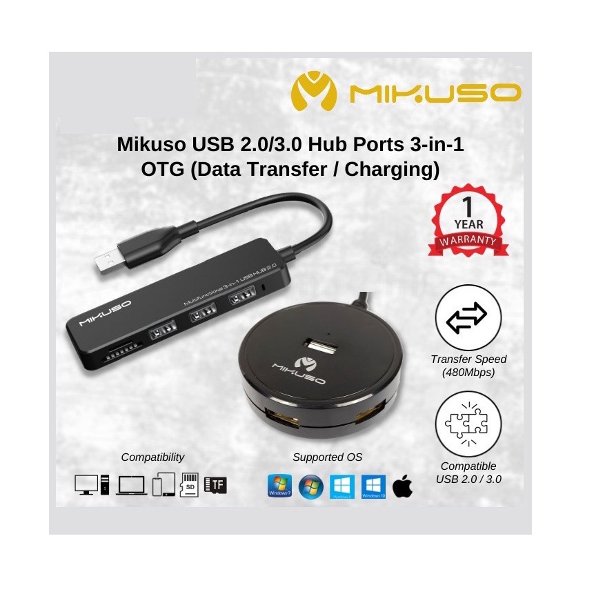 Mikuso USB Hub 2.0 High-Speed Data Transfer (Multi USB Port Hub Extension Adapter) for PC/Laptop/SD Card /Charging (HUB-011)