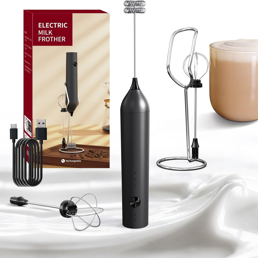 Milk Frother Rechargeable Handheld Electric 3 Gear Speed Adjustable Coffee Foaming Stick Equipped with 2 One Stainless Steel Blender Latte Cappuccino Matcha Egg Drink Mixer