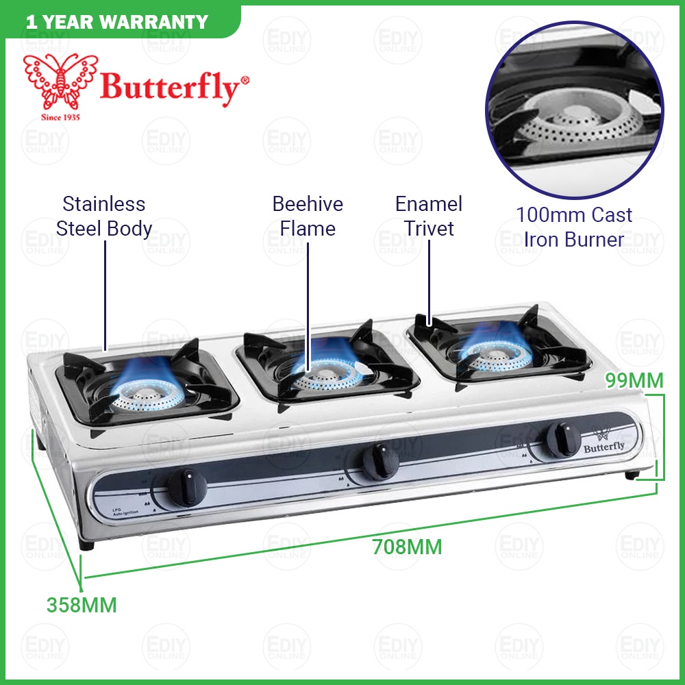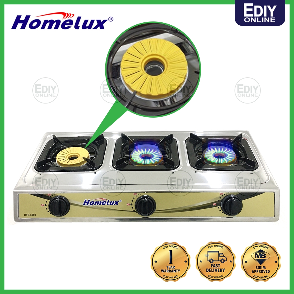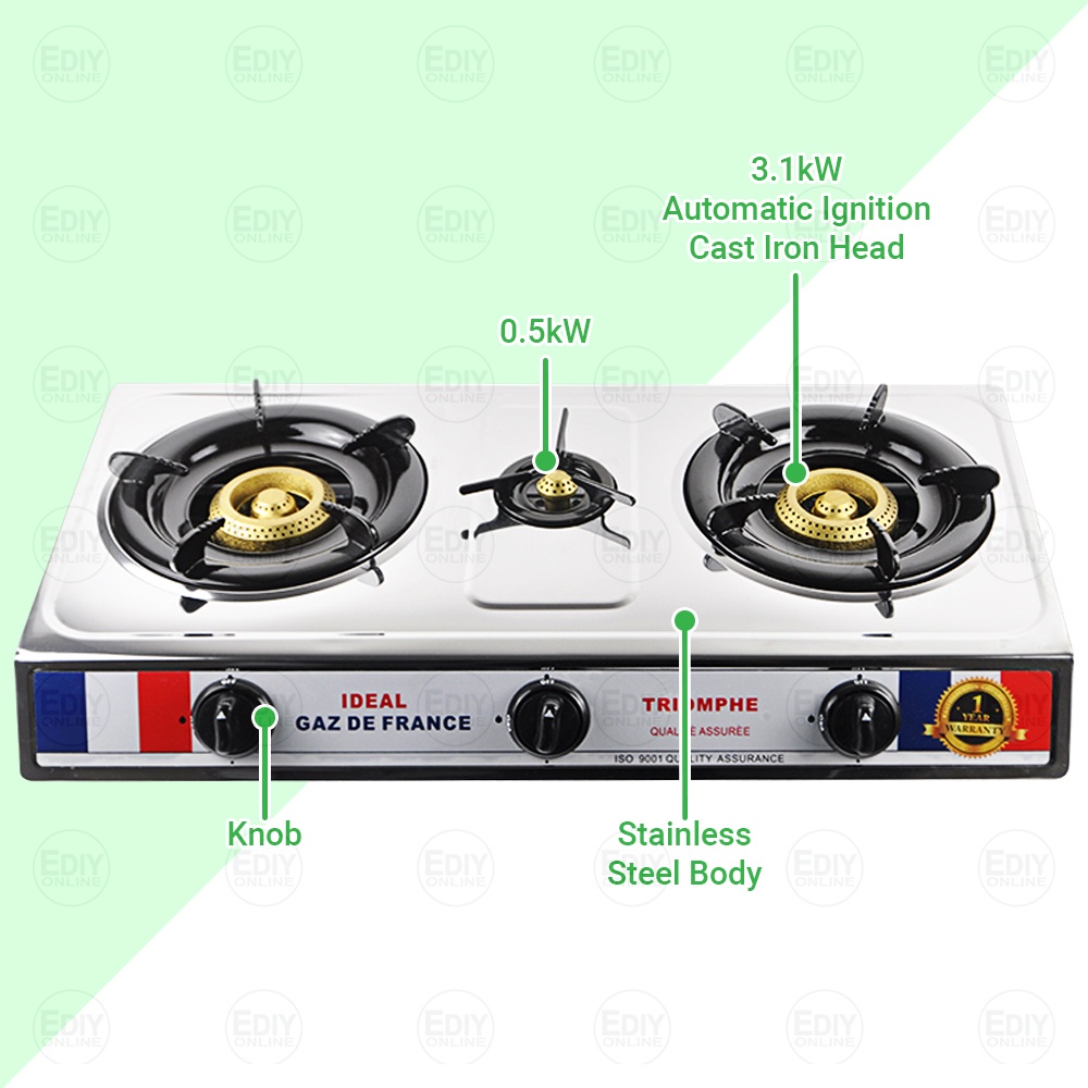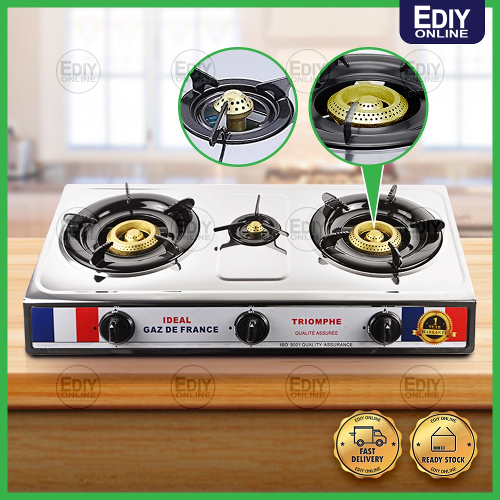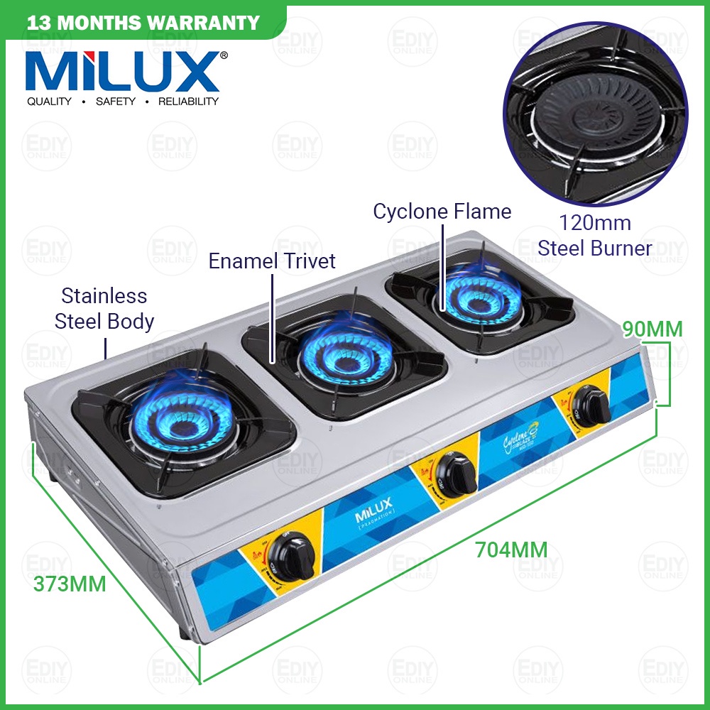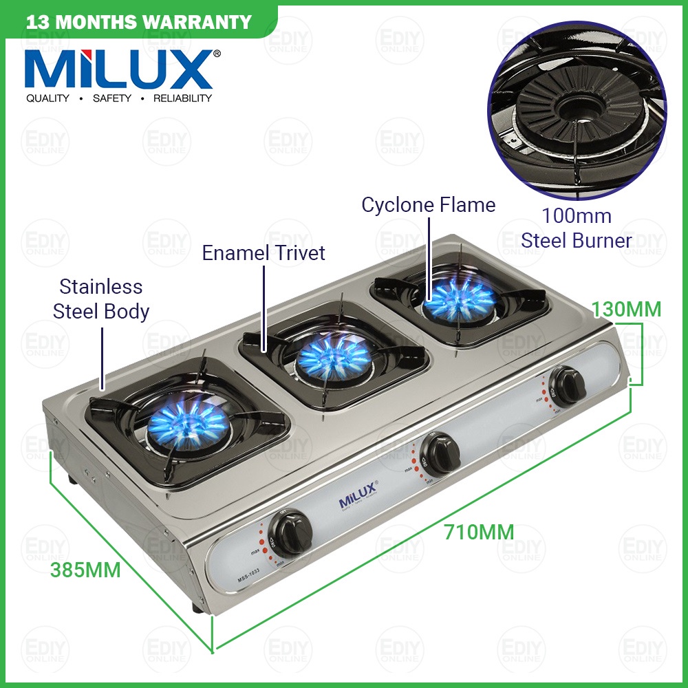 Milux MSS1033 MSS-1033 MSS-1233 Triple Burner Dapur Gas Cooker Stove Stainless Steel Body Cast Iron Masak 煤气灶