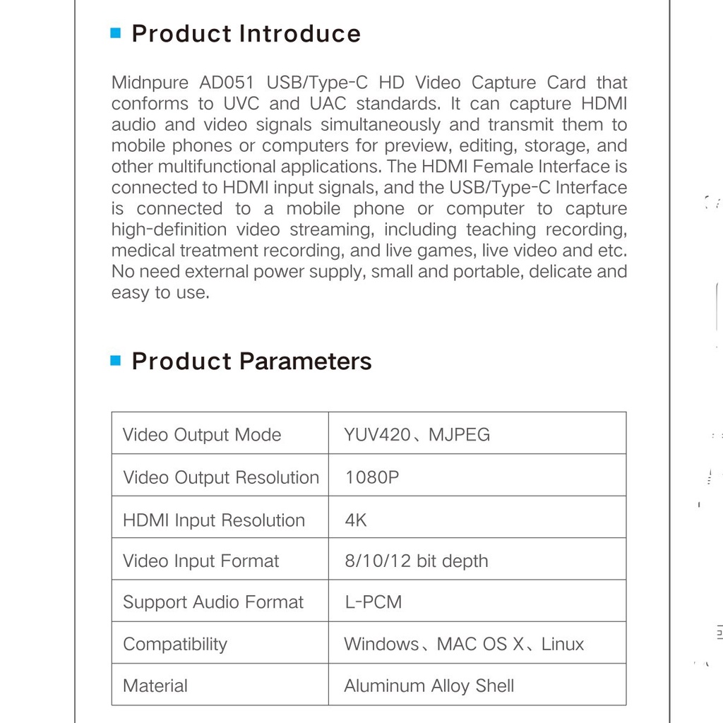 Mindpure Premium 4K HDMI Video Capture Card,HDMI to USB/USB C Audio Video Recording in 1080P@60Hz, 2K@50Hz