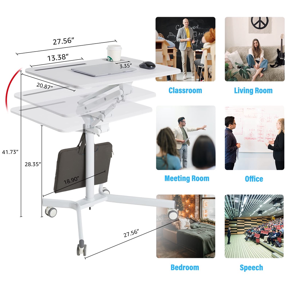 Mobile Sit Stand Desk - Height Adjustable Standing Laptop Desk Cart Rolling Couch Table on Wheels White Workstation