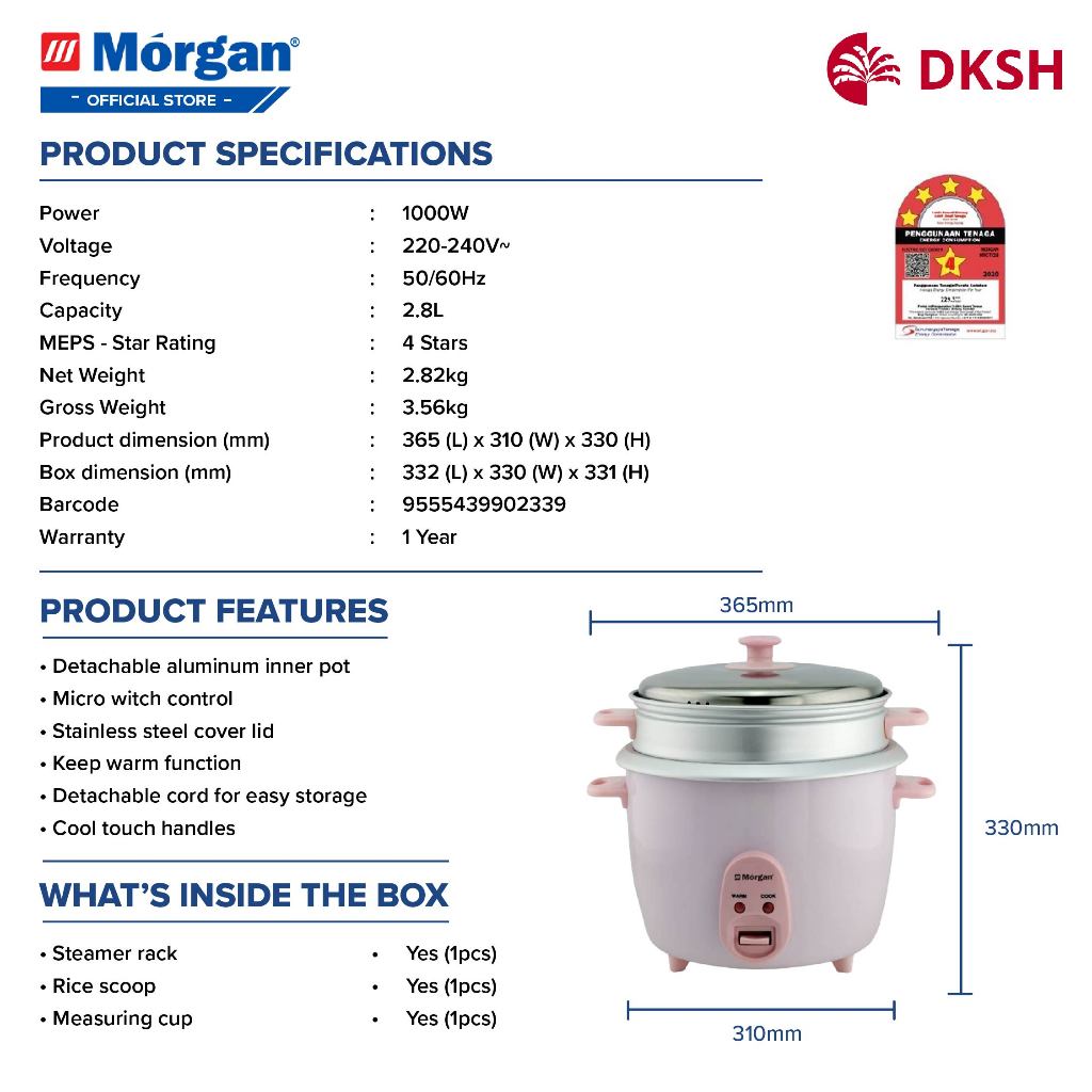 Morgan 4-Stars MEPS Traditional Rice Cooker w Mirco Switch Control (2.8L) [Free Measuring Cup & Rice Scoop] MRC-TC28
