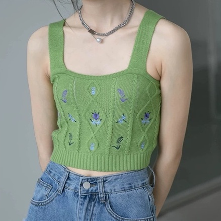 Msia Ready Stock🔥T2033-5 colors Embroidery Flower Knitted Crop Singlet Top