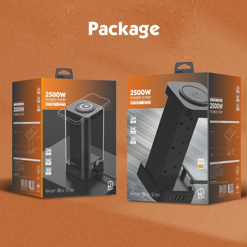 Multi Plug Power Extention Wireless Charging of Mobile Phones Tower Surge Protector Desktop Power Strip Tower Power Cord Tower Sockets Tower Extension Lead Plus wireless charging