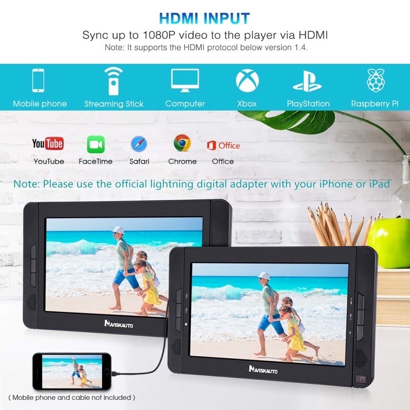 NAVISKAUTO 10.5 Inch Portable DVD Player with HDMI Input, Car Headrest Mount Bracket, Built-in Rechargeable Battery