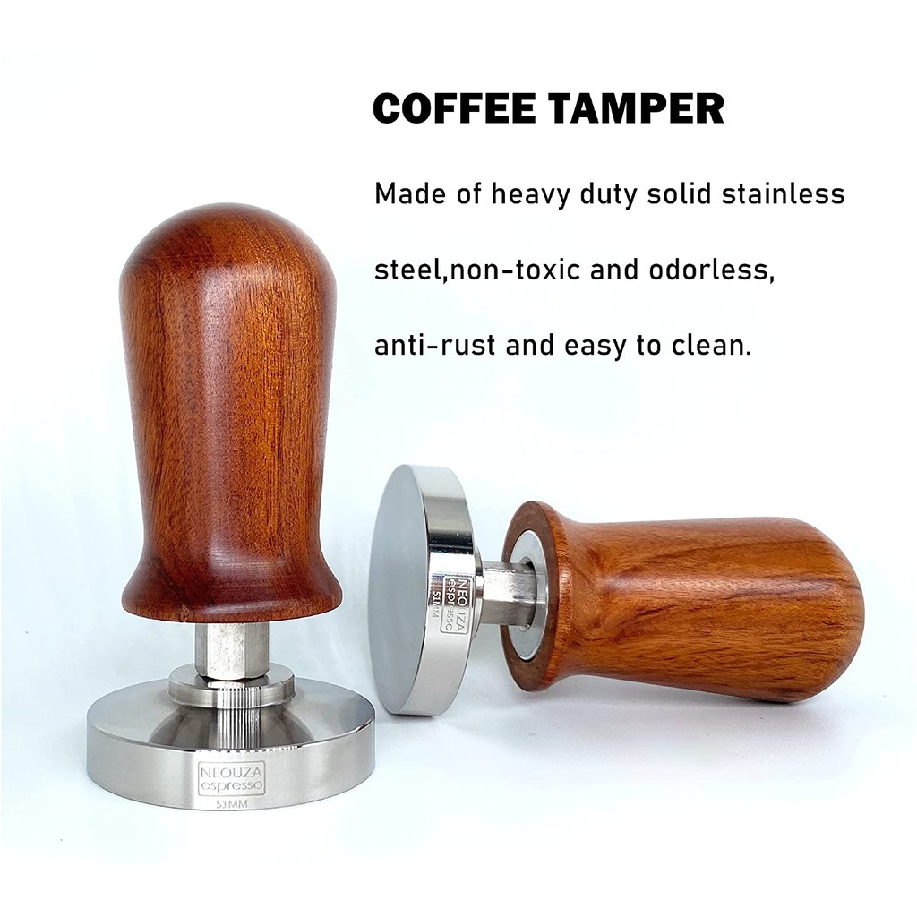 NEOUZA Calibrated Espresso Coffee 51mm 53mm 58mm Tamper Professional Pressure Coffee Press Hammer - 304 Stainless Steel Flat Base with Spring Loaded Wooden Handle for Barista