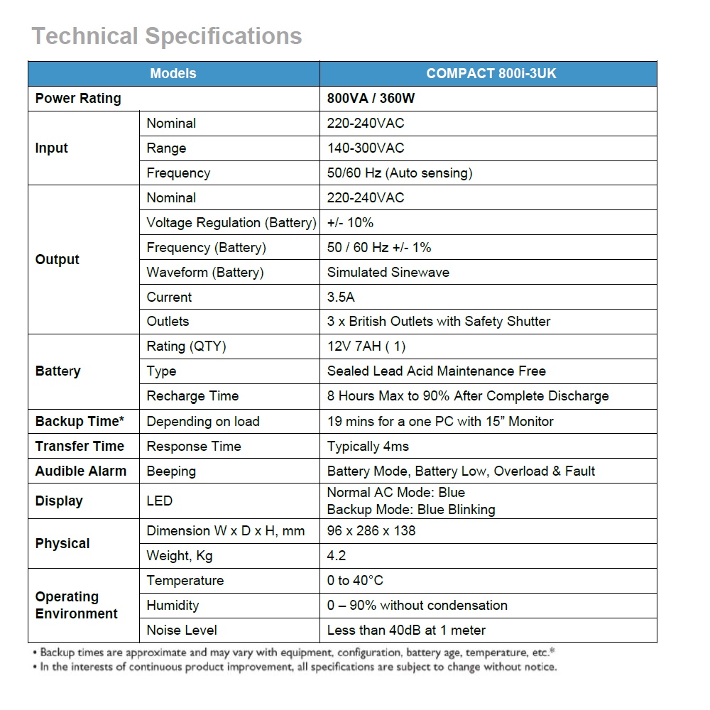 NEUROPOWER COMPACT 800i-3UK 800VA LINE INTERACTIVE AFFORDABLE COMPACT UPS/ POWER SUPPLY/ BACKUP BATTERY FOR DESKTOP OFFI