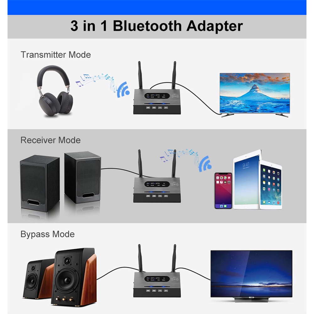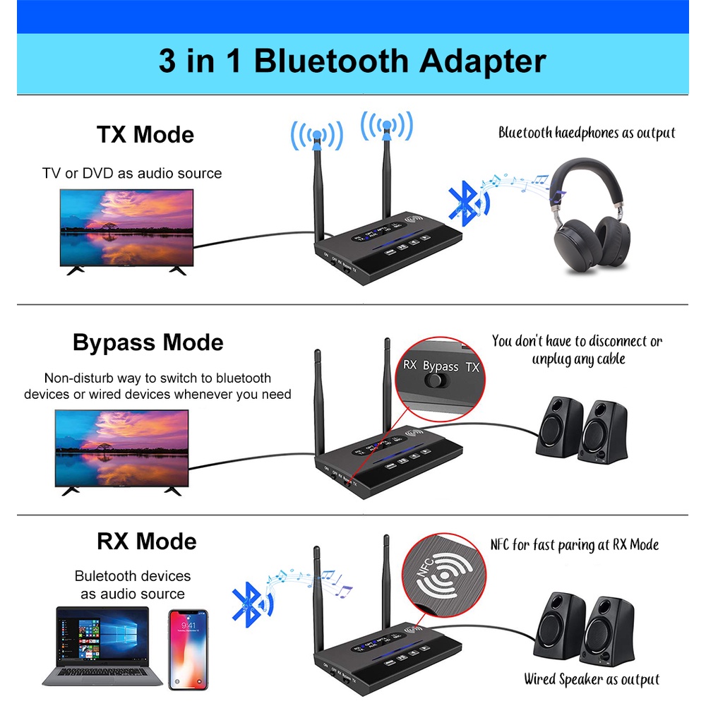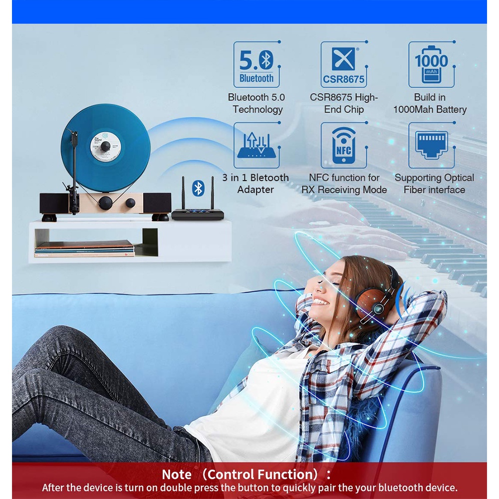 NFC 262ft/80m Long Range Bluetooth 5.0 Transmitter Receiver 3in1 Music Audio Adapter Low Latency HD