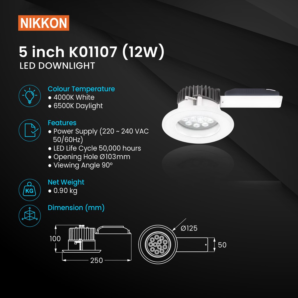 NIKKON 5 INCH LED DOWNLIGHT 12W 4000K (White) & 6500K (Daylight) [K01107]