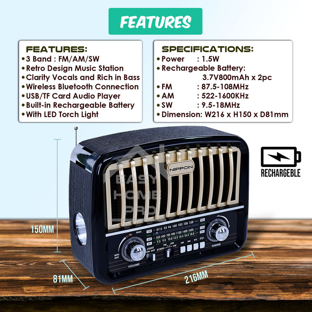NIPPON KAKAK FM/AW/SW 3 BAND PORTABLE RADIO RECHARGEABLE MULTIBAND RADIO RECEIVER WITH USB/TF/BLUETOOTH/RECHARGEABLE