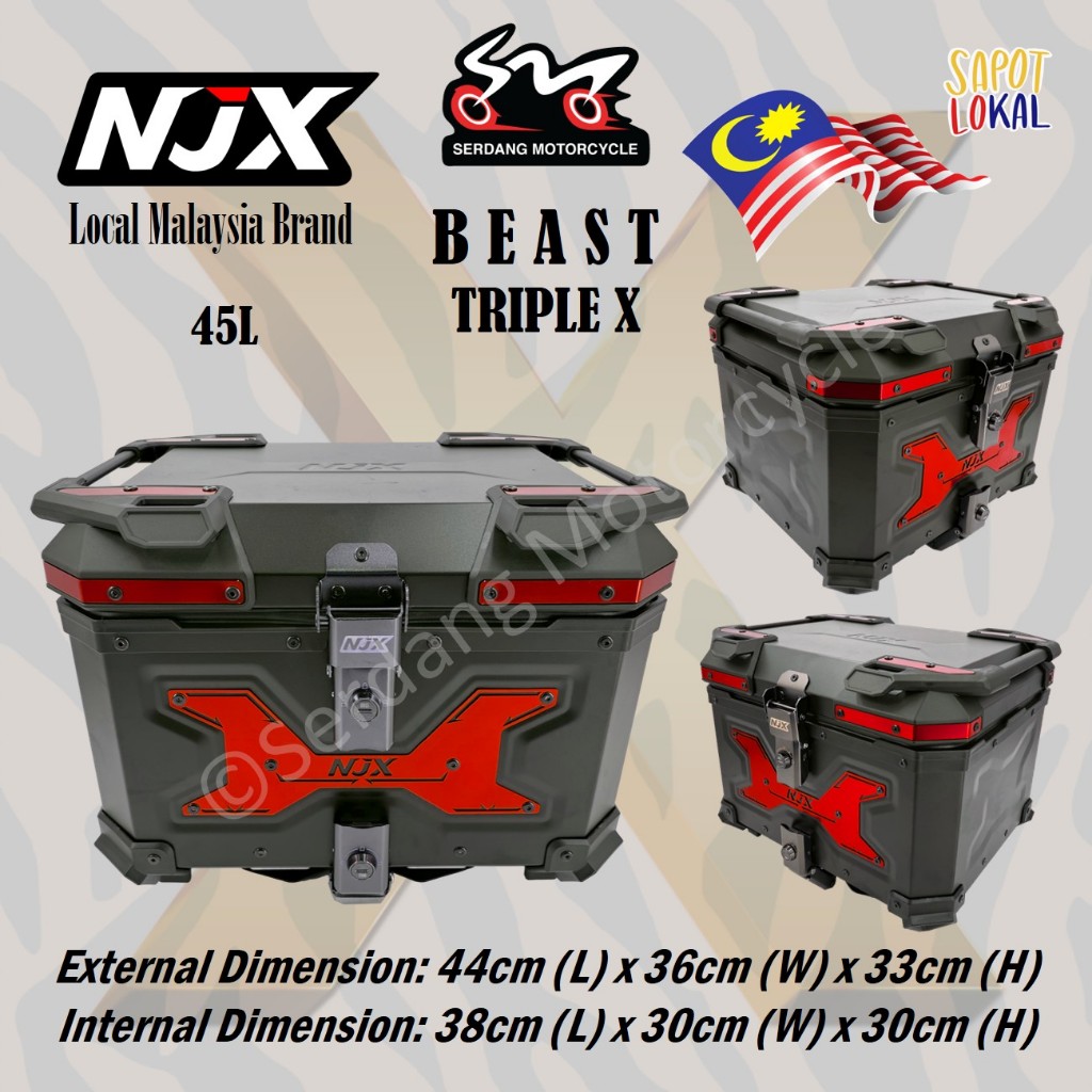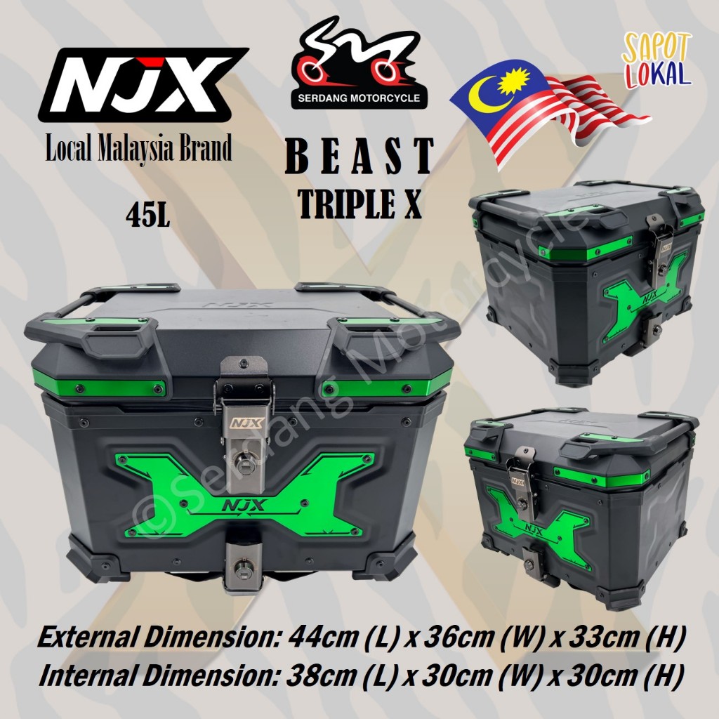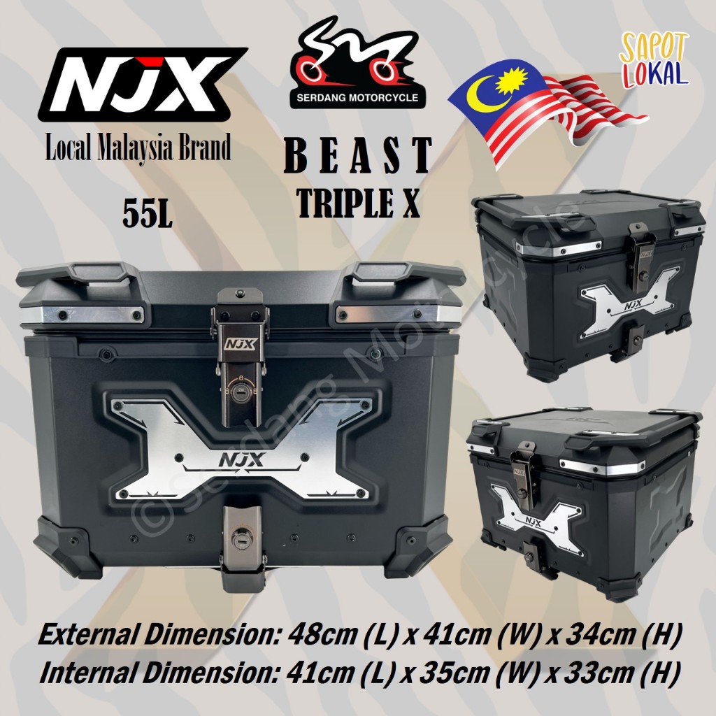 NJX Beast Kotak Motosikal Keluli Tahan Karat 45L 55L Top Box Stainless Steel Peti Motorcycle Aluminium