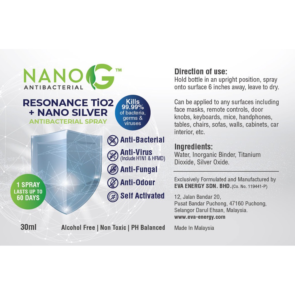 NanoG Antibacterial Spray 30ml Resonance TiO2 + Nano Silver. Kills viruses: H1N1, HFMD & CoV-OC43
