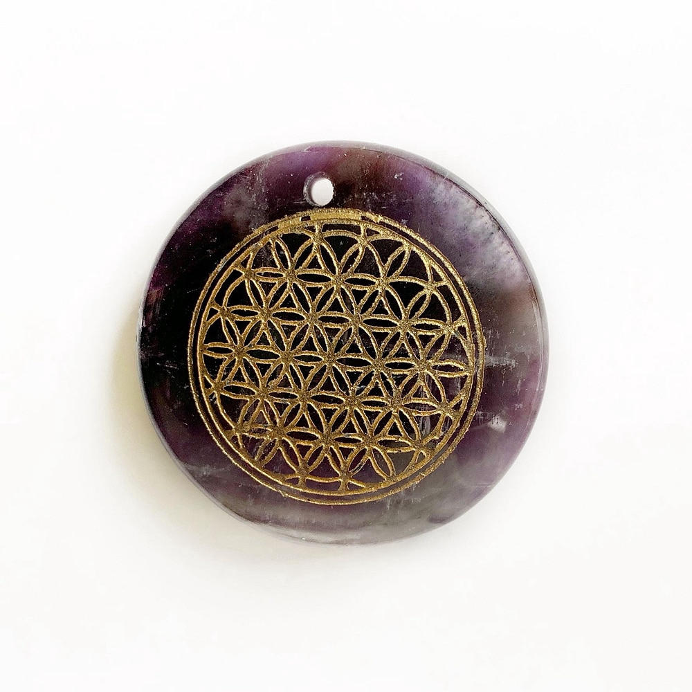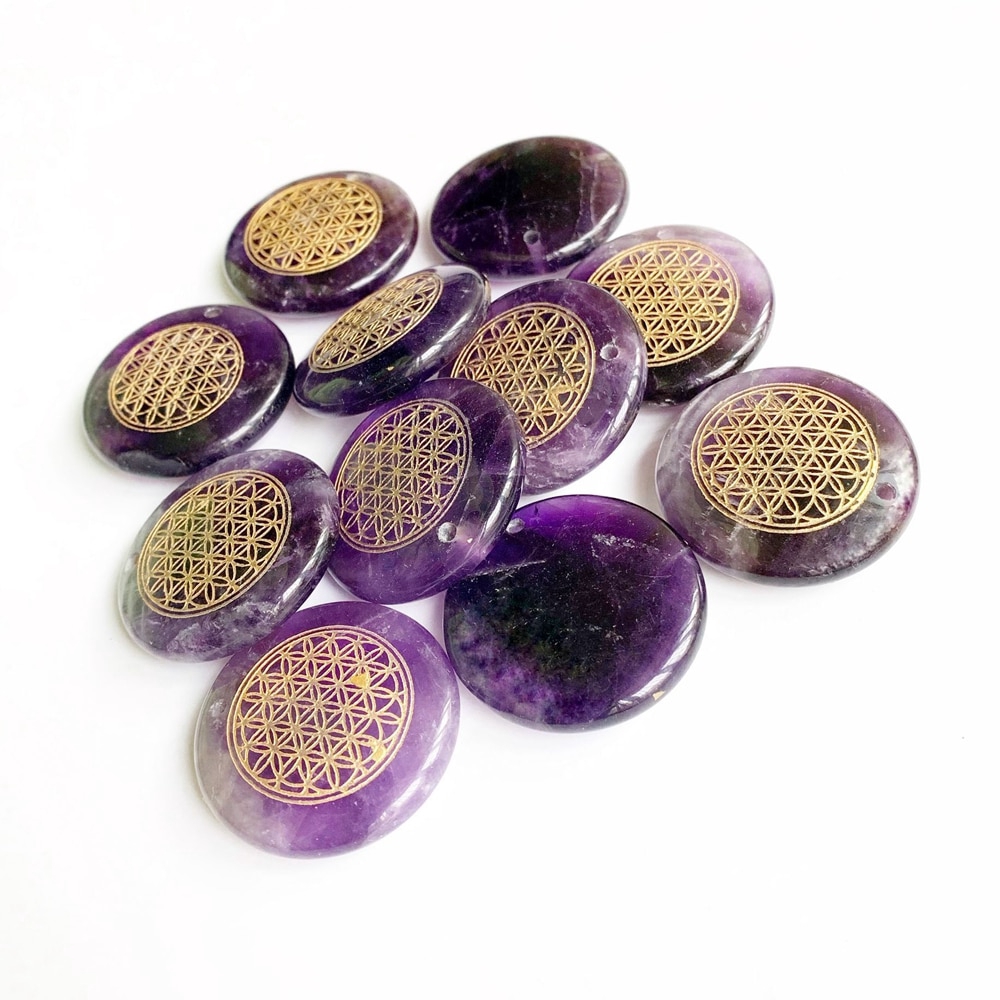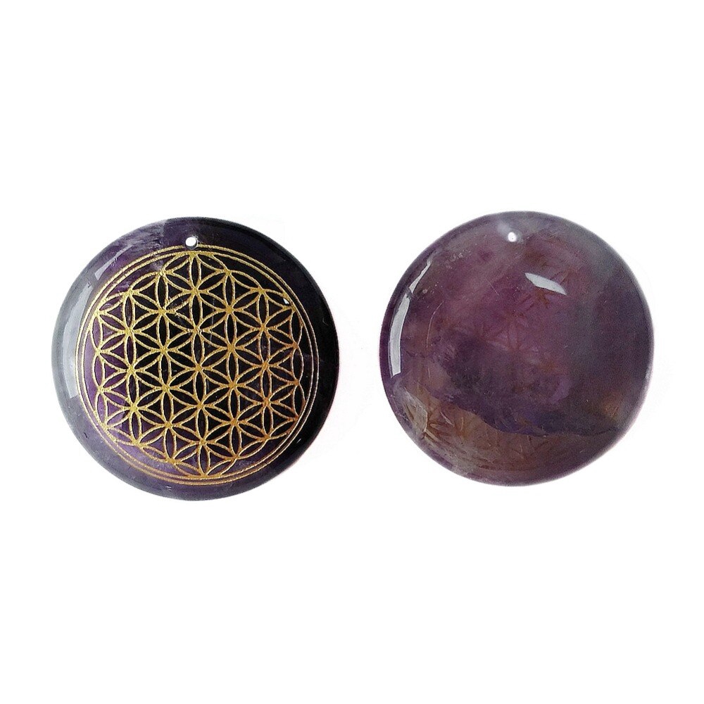 Natural Amethyst Stone Amulets Carved Flower of Life Symbols Reiki Healing Palm Stones Jewelry Pendants with Hole 1pc