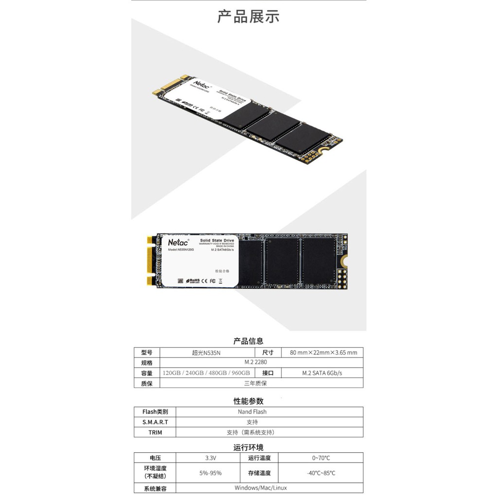 Netac Genuine M.2 SSD N535N 128GB / 256GB / 480GB M.2 2280 SATA 6Gb/s Solid State Drive