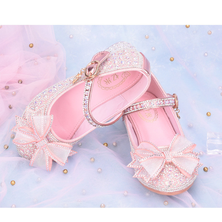 New Children Princess Shoes Girls Kids High Heels Crystal Rhinestone Pearl Bow Birthday Party Dance Shoes