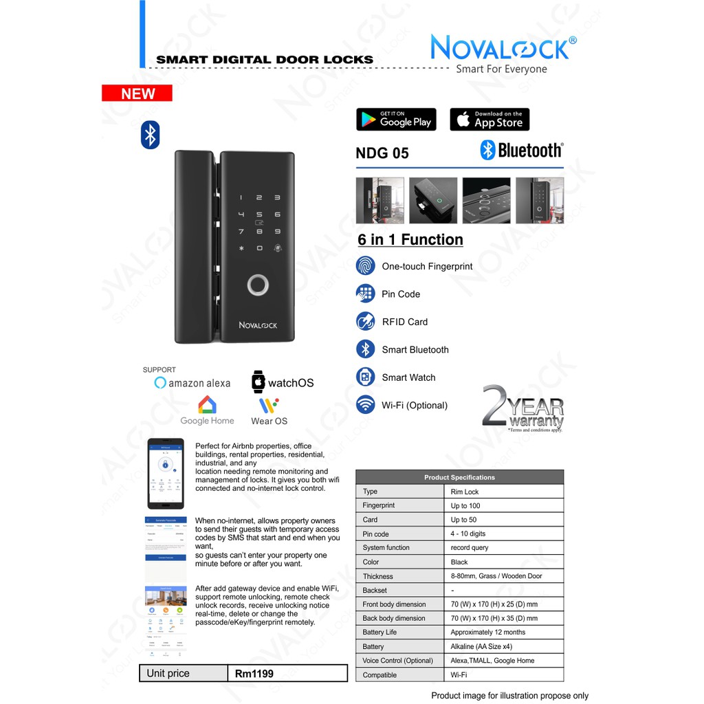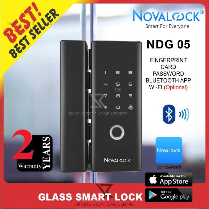 (Glass Door Smart Lock) Novalock NDG 05 Glass Door DIGITAL DOOR LOCK / Fingerprint / Bluetooth App / Pin / Card / OTP