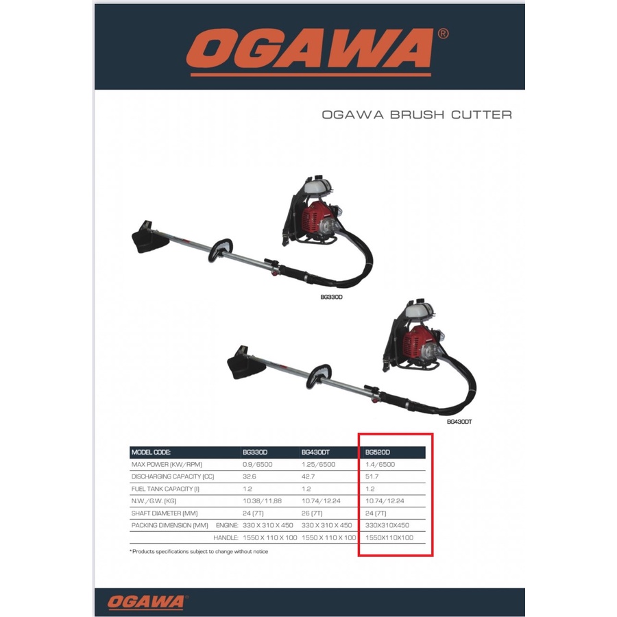 OGAWA BRUSH CUTTER BG520D (52CC) (MESIN RUMPUT/GRASS CUTTER) (FULL SET)
