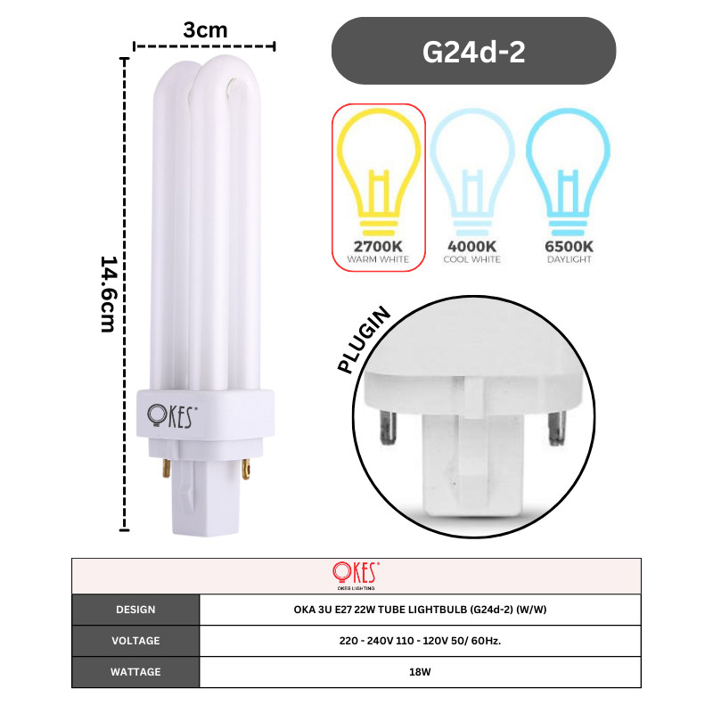 OKES 2U 3U Tube Bulb OKA Lighting Light Bulb 9w 18w 22w E27 PLC Energy Saving 2700K 6500K Lightbulb Series Lampu Mentol