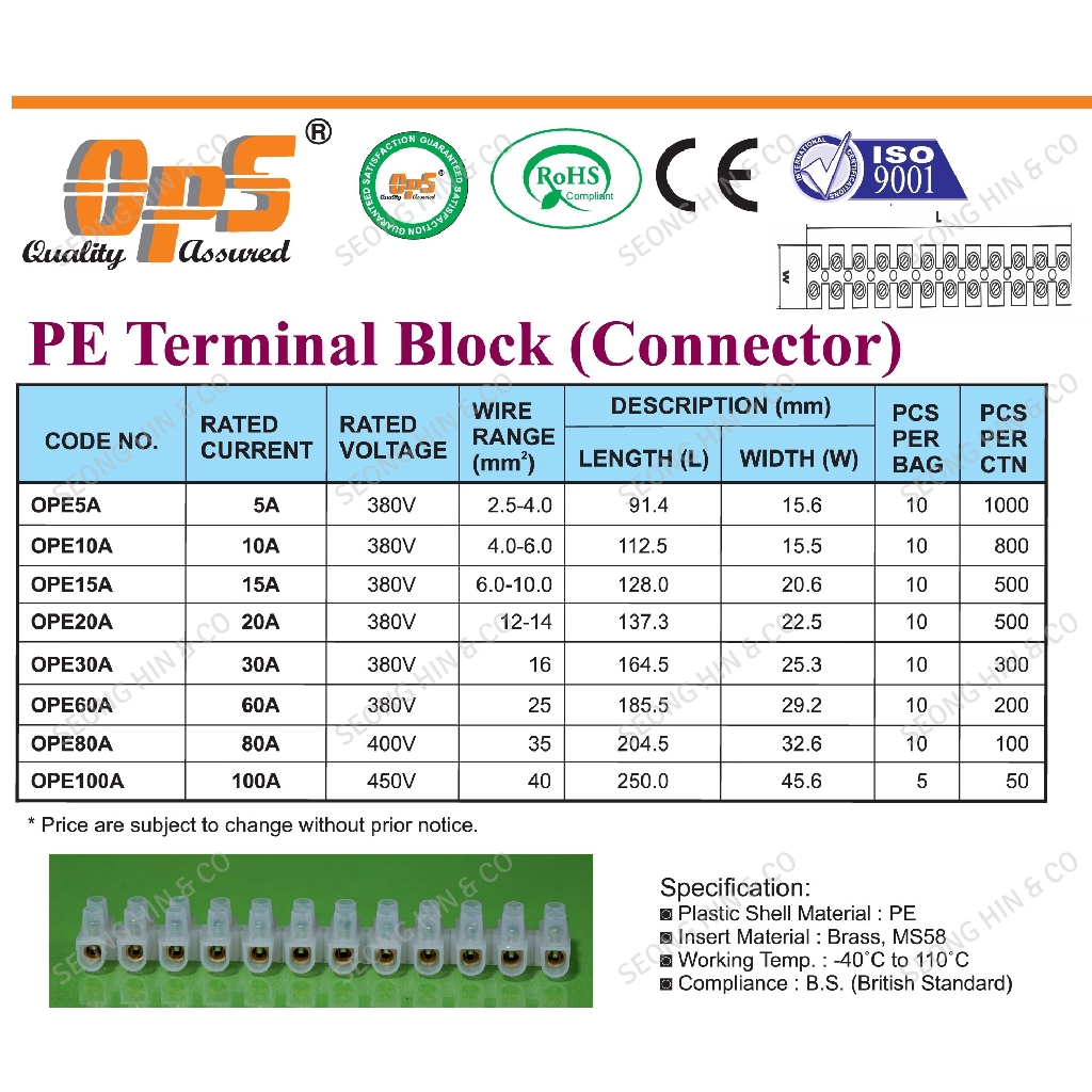 OPS PVC Connector Electrical 5A 10A 15A 20A 30A 60A / PE Terminal Block