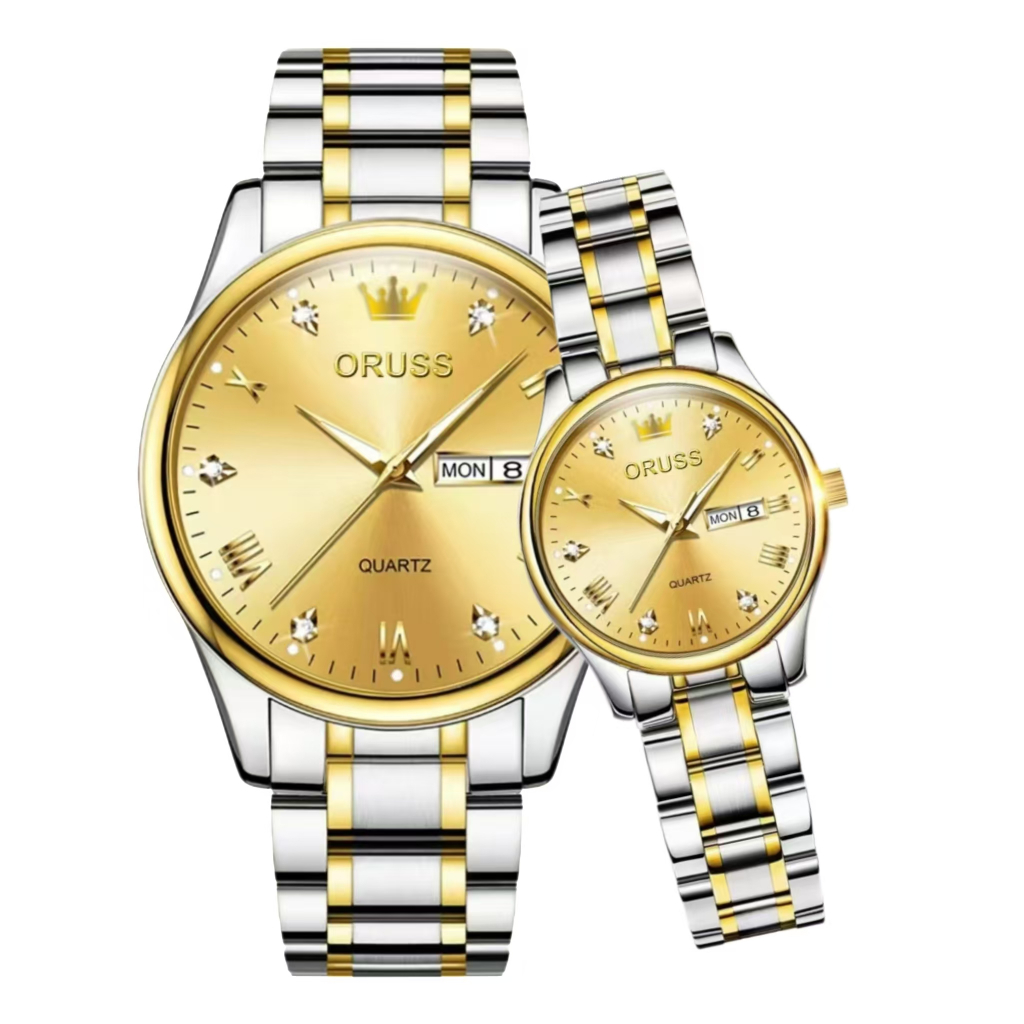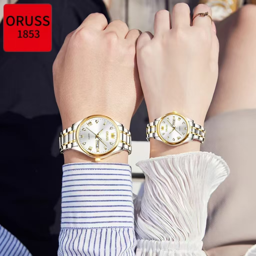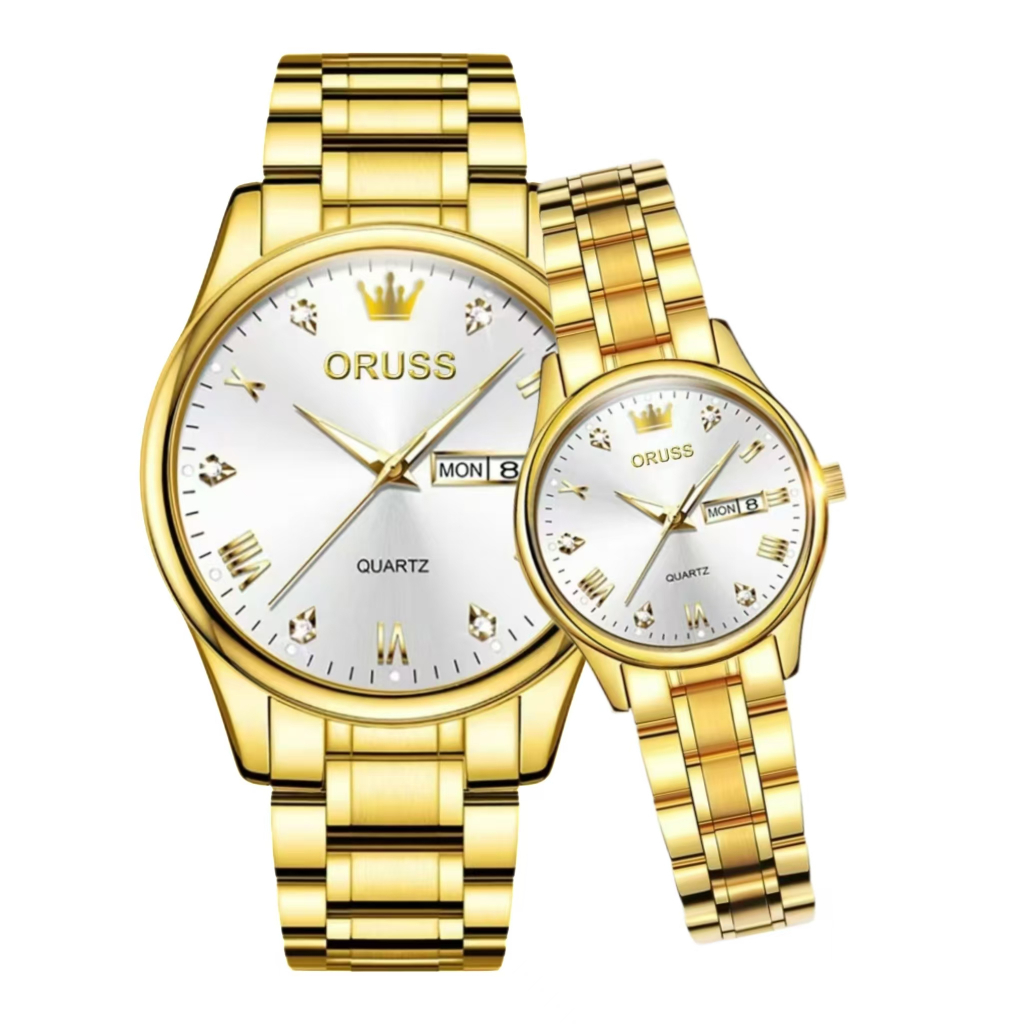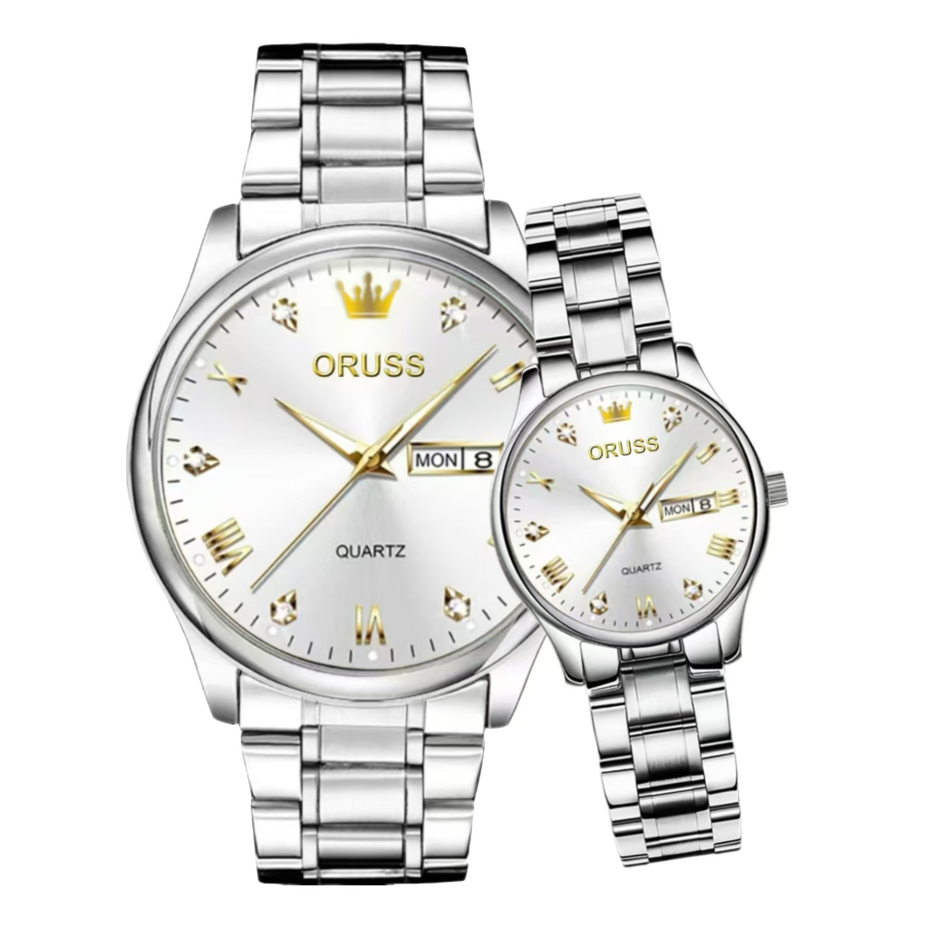 ORUSS Original 2 Pcs Couple Stainless Steel Dual Calendar Luxury Waterproof Silver/Gold Analog Watch Fashion Korean Business Automatic Quartz Wrist Watch For Couple