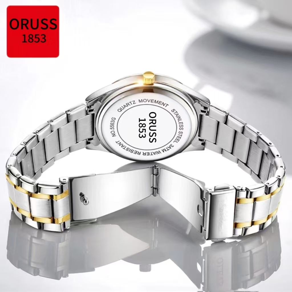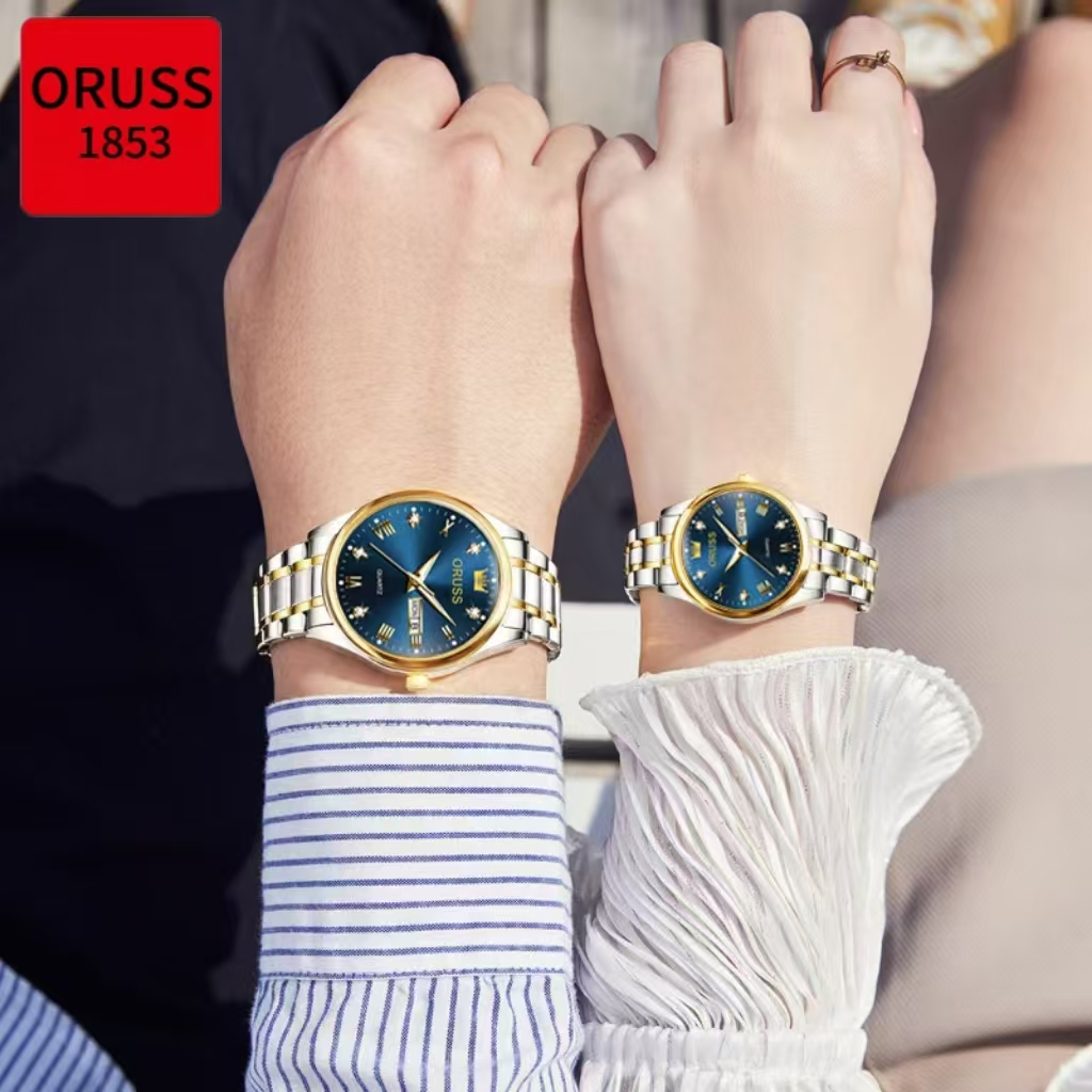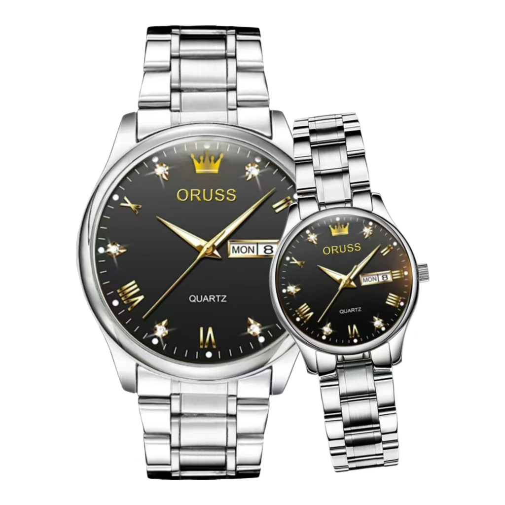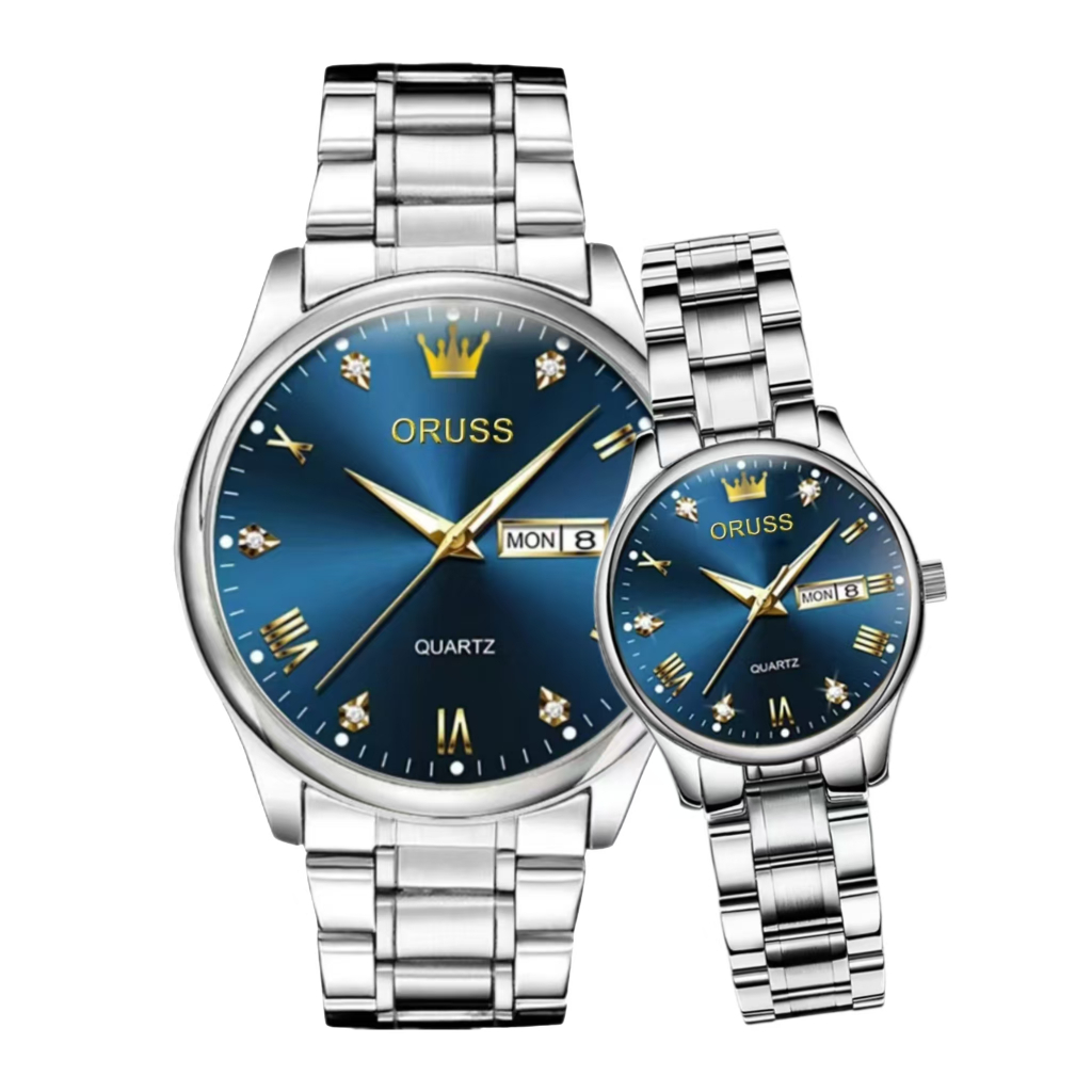 ORUSS Original 2 Pcs Couple Stainless Steel Dual Calendar Luxury Waterproof Silver/Gold Analog Watch Fashion Korean Business Automatic Quartz Wrist Watch For Couple