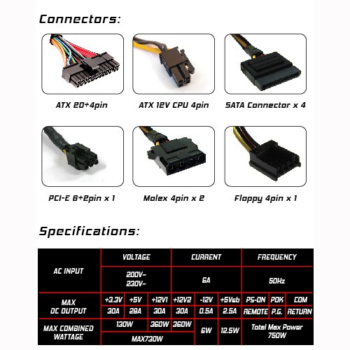Official AVF Gaming Power 750W Power Supply with PCI-E 6pin & 8Pin - 750 Watt Psu