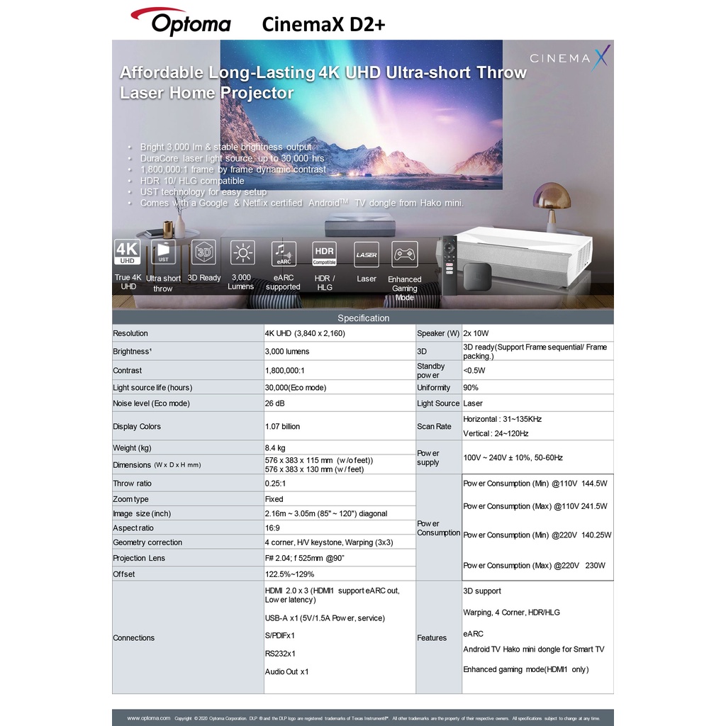 Optoma CinemaX D2+ 4K UHD Cinema TV Ultra Short Throw Laser Home Cinema Projector | Smart 4K TV | Home Theater