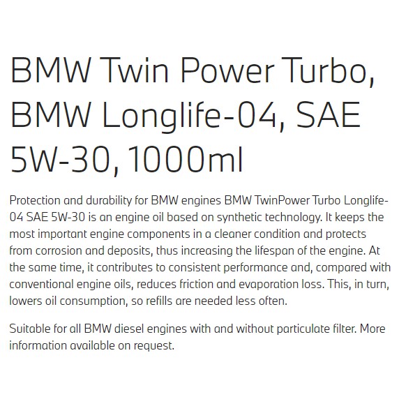 Original BMW SAE 5W30 Twin Power Turbo Engine Oil (1Litre), BMW Longlife-04 LL-04 & BMW Longlife-01 LL-01 , 5W-30