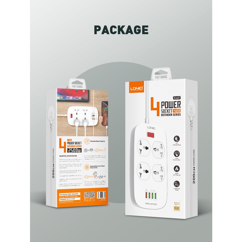 Original Ldnio 4 USB + 4 Socket multi charging & 3A Fast charging 2 meter home charger travel extension 2M wire