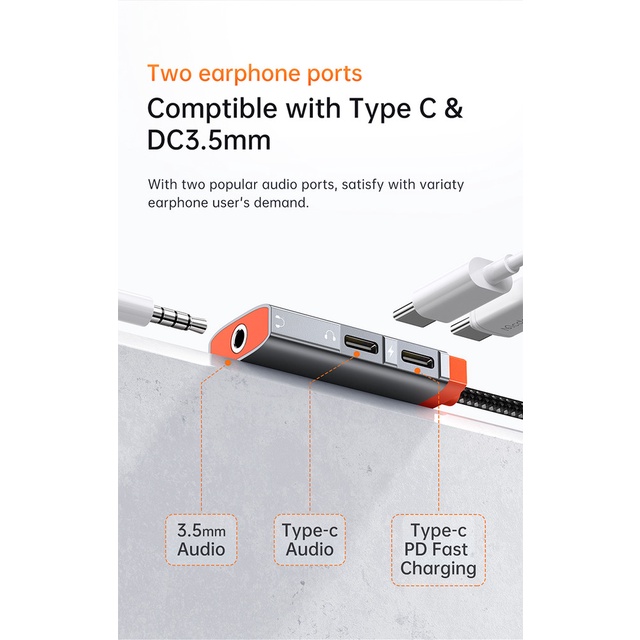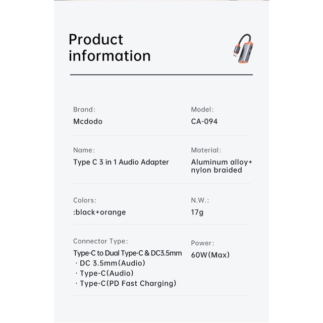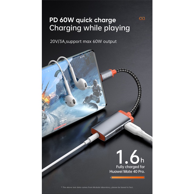 Original Mcdodo Adapter Type C Audio Adapter 60W Fast Charging Adapter Type C to Dual Type C+3 5mm Adapter