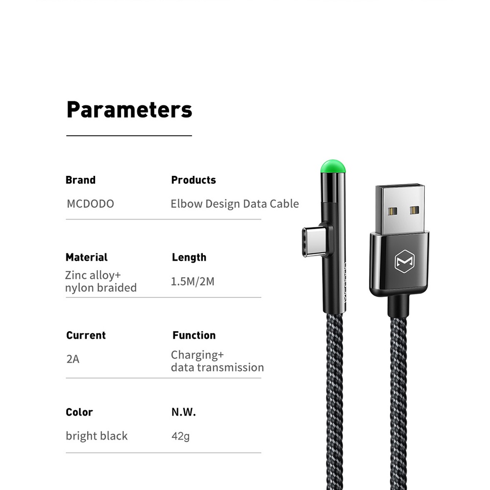 Original Mcdodo Type C Usb C lP Gaming Data Cable LED Light 2A Phone Charging Cables 1.5M 2 Meter