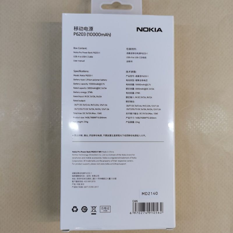 Original Nokia P6203 Power Bank 20W Fast Charging Dual USB Port & Type-C USB With Type C USB Cable