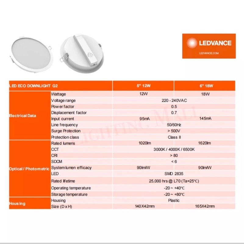 Osram Ledvance Led Downlight Eco Downlight G2 12w 5inch/ 18w 6inch Lampu siling kapur Osram