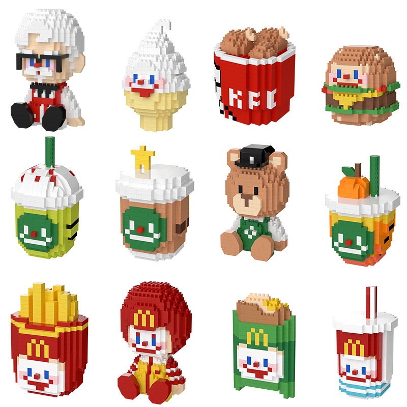 PANNIE Mini Blocks 4in1 Fast Food Restaurant Series KFC MCD Bear Cafe Food Drink Burger Fries Building Bricks Collection