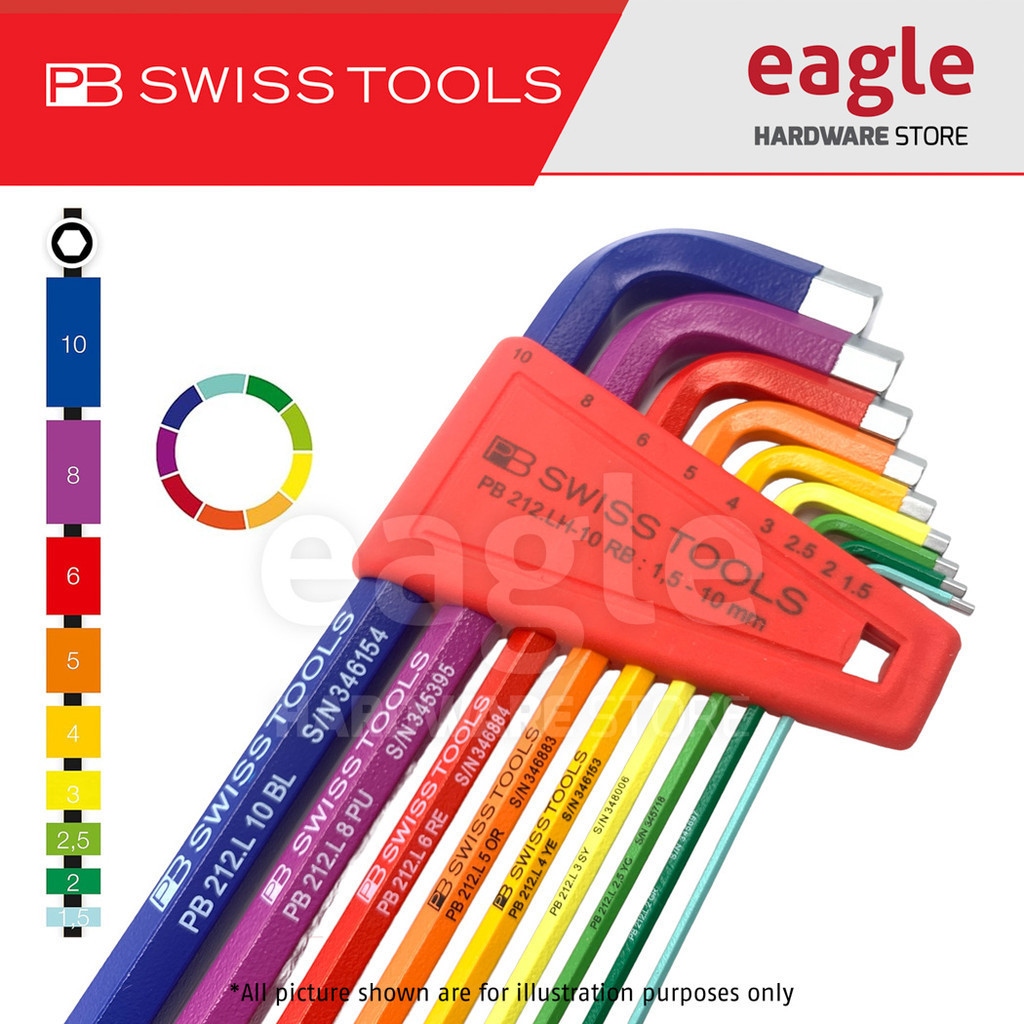 PB Swiss Tools PB212.LH-10RB Allen Key / Hex Key Wrench, Color, 1.5 ~ 10.0mm, Ball Point, Long, Plastic Holder, 9pcs