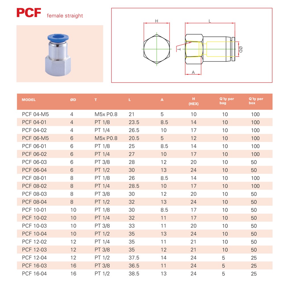 PCF FEMALE STRAIGHT One Touch Fitting-METRIC SYSTEM